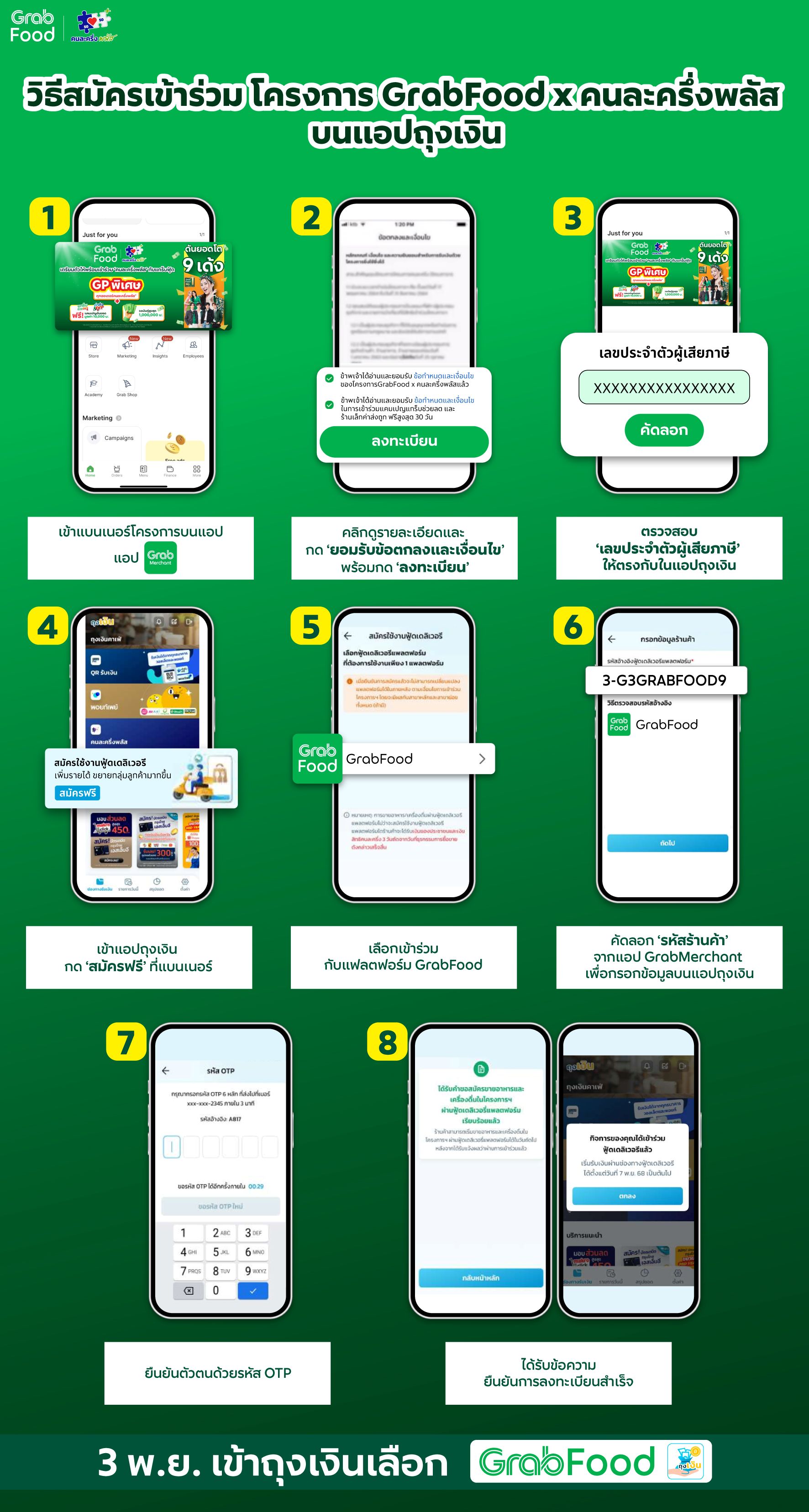 ผู้ประกอบการร้านอาหารที่สนใจเข้าร่วมโครงการ “คนละครึ่งพลัส” กับแกร็บฟู้ด เพื่อรับสิทธิประโยชน์จากแคมเปญ “GrabFood X คนละครึ่งพลัส ดันยอดโตสูงสุด 9 เด้ง” สามารถลงทะเบียนได้ตั้งแต่วันที่ 3 พฤศจิกายน 2568 – 31 ธันวาคม 2568 เพียงทำการลงทะเบียนเพื่อรับสิทธิบนแอปฯ ถุงเงิน และเลือกเข้าร่วมคนละครึ่งพลัสกับแกร็บฟู้ด ตามขั้นตอนดังต่อไปนี้