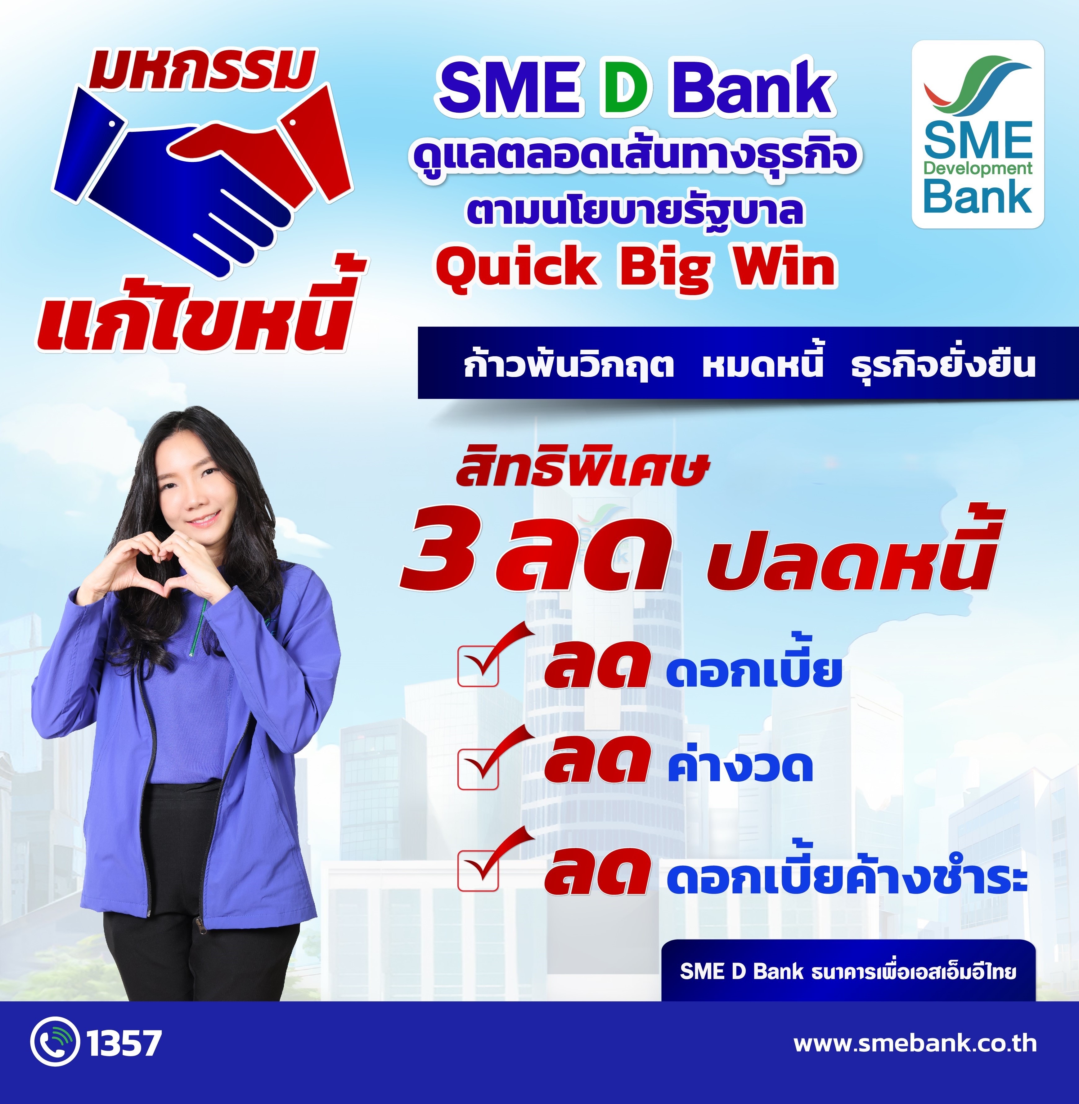 นายพิชิต มิทราวงศ์ กรรมการผู้จัดการ ธนาคารพัฒนาวิสาหกิจขนาดกลางและขนาดย่อมแห่งประเทศไทย (ธพว.) หรือ SME D Bank พร้อมด้วยผู้บริหารและเจ้าหน้าที่ ขับเคลื่อนนโยบายเศรษฐกิจ “Quick Big Win” ของรัฐบาล และกระทรวงการคลัง  ในด้านการช่วยเหลือผู้ประกอบการเอสเอ็มอีกลุ่มเปราะบางที่ได้รับผลกระทบจากสถานการณ์เศรษฐกิจโลกและเศรษฐกิจไทยที่เผชิญความไม่แน่นอน ส่งผลกระทบต่อการดำเนินธุรกิจ ทั้งยอดขายที่ลดลง รายได้หดหาย กระทบต่อการชำระคืนหนี้ จัดกิจกรรม “มหกรรมแก้ไขหนี้ : ก้าวพ้นวิกฤต หนี้หมด ธุรกิจยั่งยืน”  เมื่อวันที่ 16-17 ตุลาคม 2568  ที่ผ่านมา ณ สำนักงานใหญ่ SME D Bank เพื่อช่วยเหลือผู้ประกอบการเอสเอ็มอีกลุ่มเปราะบาง ให้ลดภาระทางการเงิน สร้างโอกาสพลิกฟื้นธุรกิจกลับมาเดินหน้าได้อีกครั้ง และพร้อมก้าวต่อสู่ความมั่นคงอย่างยั่งยืนในอนาคต
