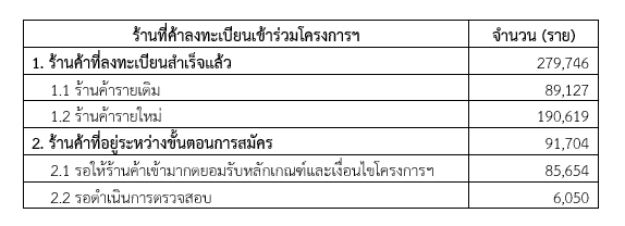 สำหรับความคืบหน้าของการลงทะเบียนผู้ประกอบการร้านค้าที่เข้าร่วมโครงการฯ ในช่วงที่ผ่านมามีร้านค้าที่เข้าร่วมโครงการเพิ่มขึ้นอย่างต่อเนื่อง จากข้อมูลสะสม ณ วันอังคารที่ 21 ตุลาคม 2568 เวลา 16.00 น. มีร้านค้าที่ลงทะเบียนเข้าร่วมโครงการฯ ดังตาราง