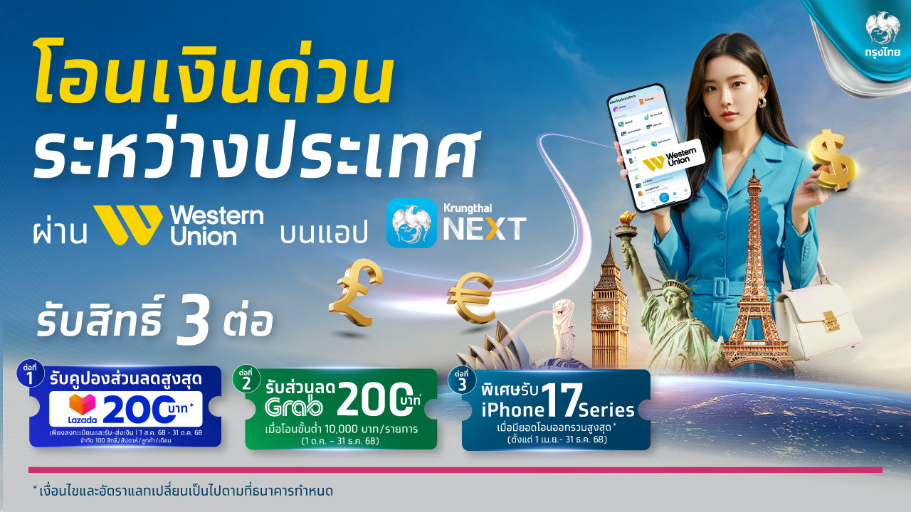 ธนาคารกรุงไทย มุ่งมั่นพัฒนาผลิตภัณฑ์และบริการทางการเงินอย่างต่อเนื่อง เพื่อตอบโจทย์ลูกค้า          ทุกกลุ่มในทุกมิติ พร้อมสนับสนุนการเข้าถึงบริการทางการเงินที่ทันสมัย สะดวก และปลอดภัย ครอบคลุมธุรกรรมในประเทศ และต่างประเทศ ล่าสุด ออกโปรโมชัน “คุ้ม 3 ต่อ” สำหรับบริการโอนเงินด่วนระหว่างประเทศผ่านเวสเทิร์น ยูเนี่ยน (Western Union) ที่ให้บริการครอบคลุมกว่า 200 ประเทศทั่วโลกบนแอปพลิเคชัน Krungthai NEXT สาขา ตู้ ATM และบูธแลกเปลี่ยนเงินตราต่างประเทศ