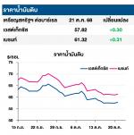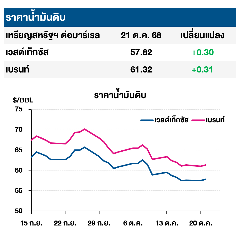 (+) ราคาน้ำมันดิบเวสต์เท็กซัสและเบรนท์ปรับเพิ่มขึ้น หลังน้ำมันดิบและน้ำมันเบนซินคงคลังสหรัฐฯ อยู่ในระดับค่อนข้างต่ำ โดยสถาบันปิโตรเลียมของอเมริกา (API)ได้เผยตัวเลขน้ำมันดิบคงคลังที่ปรับลดลง 2.98 ล้านบาร์เรล รวมถึงน้ำมันเบนซินคงคลังที่ลดลง 236,00 บาร์เรล ณ สัปดาห์สิ้นสุดวันที่ 17 ต.ค. นอกจากนี้สหรัฐยังมีแผนการซื้อน้ำมันดิบ 1 ล้านบาร์เรลเพื่อการสำรองทางยุทธศาสตร์