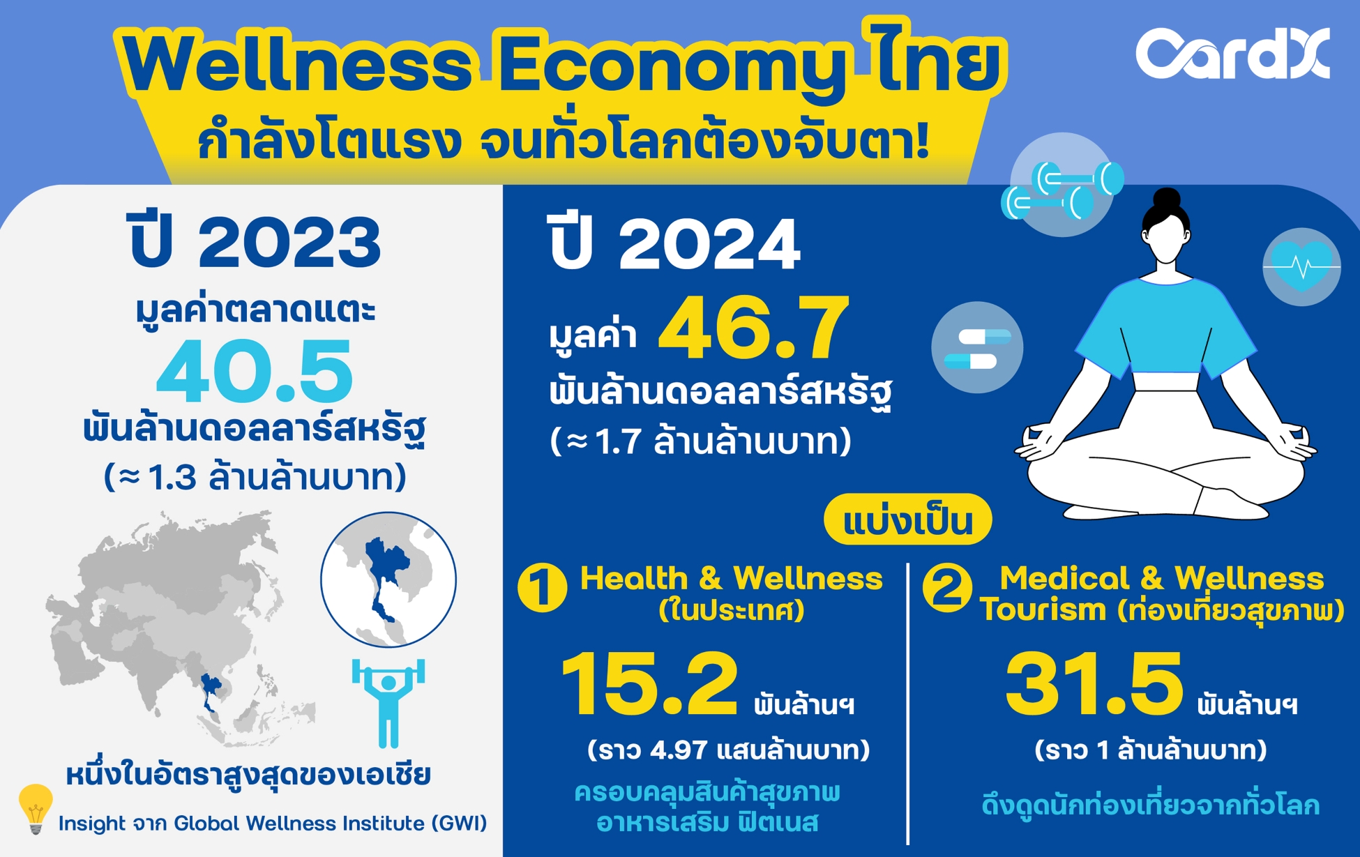 จากรายงานของ Global Wellness Institute (GWI) เผยว่า ตลาดสุขภาพและ Wellness Economy ของไทยกำลังเติบโตอย่างก้าวกระโดด จนทั่วโลกต้องจับตา! โดยในปี 2023 มูลค่าตลาด Wellness Economy ของไทยพุ่งแตะกว่า 1.3 ล้านล้านบาท เติบโตแรงถึง 28.4% ภายในปีเดียว ซึ่งนับเป็นหนึ่งในอัตราการเติบโตสูงสุดในเอเชีย และคาดว่าจะขยายตัวต่อเนื่องแตะระดับ 1.7 ล้านล้านบาทในปี 2024 โดยแบ่งเป็นตลาด Health & Wellness ภายในประเทศกว่า 497,000 ล้านบาท ครอบคลุมสินค้าสุขภาพ อาหารเสริม และบริการด้านฟิตเนส และตลาด Medical & Wellness Tourism มูลค่ากว่า 1 ล้านล้านบาท ที่ดึงดูดนักท่องเที่ยวเชิงสุขภาพจากทั่วโลกเข้าสู่ประเทศไทย