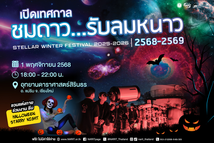 สถาบันวิจัยดาราศาสตร์แห่งชาติ (องค์การมหาชน) (สดร. หรือ NARIT) กระทรวงการอุดมศึกษา วิทยา ศาสตร์ วิจัยและนวัตกรรม (อว.) ชวนคนไทยดูดาวหนาวนี้ เริ่มอีเวนต์แรก 1 พฤศจิกายน 2568 “เปิดเทศกาลชมดาว…รับลมหนาว” ดูดาวทุกคืนวันเสาร์ พร้อมกัน 5 แห่ง ได้แก่ อุทยานดาราศาสตร์สิรินธร อ. แม่ริม จ. เชียงใหม่ และหอดูดาวเฉลิมพระเกียรติฯ นครราชสีมา ขอนแก่น ฉะเชิงเทรา และสงขลา พร้อมเปิดโผ 10 อีเวนต์ดาราศาสตร์ที่น่าสนใจตลอดช่วงฤดูหนาวนี้