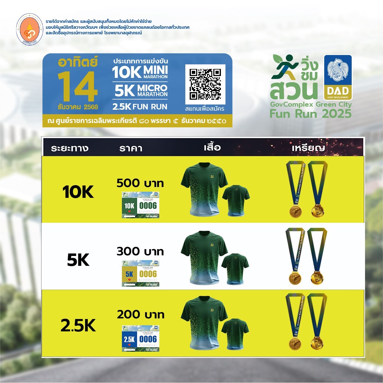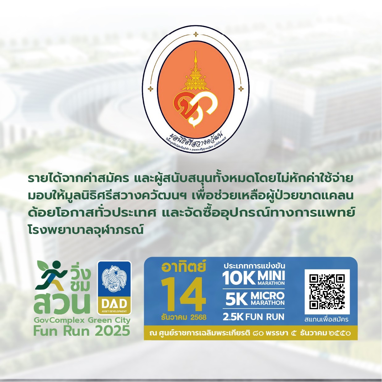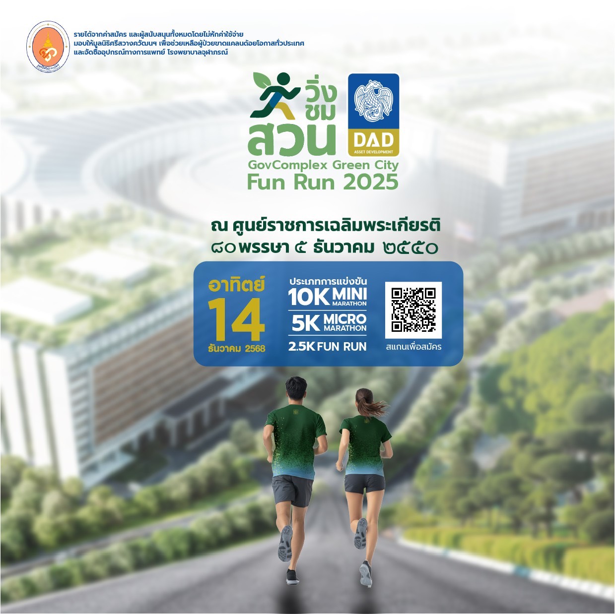 ธพส.โชว์ความสำเร็จพัฒนาพื้นที่ศูนย์ราชการเฉลิมพระเกียรติฯ สู่เมืองสีเขียวกว่า 138 ไร่ ชวนประชาชนทดลองใช้พื้นที่ และสร้างประสบการณ์ใหม่ด้วยกิจกรรมมินิมาราธอน“วิ่งชมสวน : GovComplex Green City Fun Run 2025” นัดหมาย 14 ธันวาคม 68 พร้อมเปลี่ยนทุกก้าวเป็นพลัง สมทบทุนมูลนิธิศรีสวางควัฒนฯ เพื่อผู้ป่วยด้อยโอกาสทั่วประเทศ-จัดซื้ออุปกรณ์ทางการแพทย์ รพ.จุฬาภรณ์ เปิดรับสมัครตั้งแต่วันที่ 22 ตุลาคม เป็นต้นไปที่ http://race.thai.run/govgreencityfunrun2025