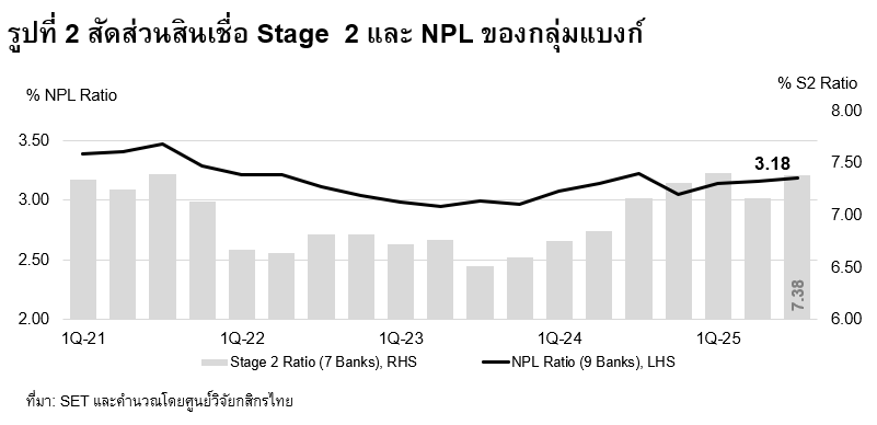 ทั้งนี้ แม้ว่าสัดส่วนสินเชื่อด้อยคุณภาพ หรือ NPL ratio ตามข้อมูลงบการเงินรวมของธนาคารพาณิชย์ 9 แห่ง ขยับสูงขึ้นเพียงเล็กน้อยมาที่ 3.18% ต่อสินเชื่อรวมในไตรมาส 3/2568 จากระดับ 3.16% ต่อสินเชื่อรวมในไตรมาส 2/2568 (รูปที่ 2) แต่สินเชื่อที่มีการเพิ่มขึ้นอย่างมีนัยสำคัญของความเสี่ยงด้านเครดิต หรือ Stage 2 ratio ที่ยังคงอยู่ในระดับสูงประมาณ 7.38% ของสินเชื่อรวมในไตรมาสที่ 3/2568 สะท้อนว่า คุณภาพของพอร์ตสินเชื่อยังมีความเสี่ยงที่จะด้อยลงในระยะข้างหน้า โดยเฉพาะหากแนวโน้มเศรษฐกิจและรายได้ภาคครัวเรือนยังไม่ฟื้นกลับมาเป็นปกติ และมีผลกระทบต่อเนื่องต่อความสามารถในการชำระหนี้ของลูกหนี้