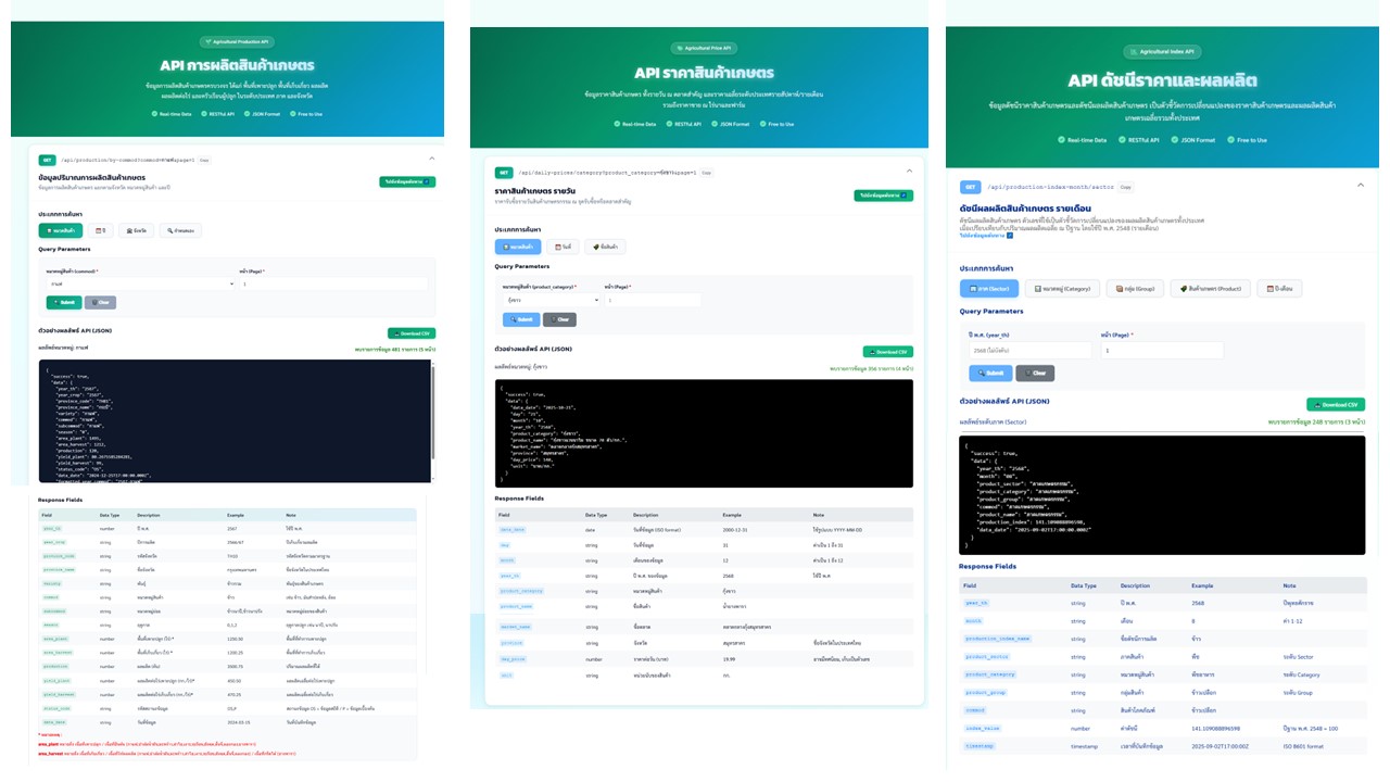 Agricultural Data Service API ที่เปิดให้บริการในเบื้องต้น ประกอบด้วย 1. API การผลิตสินค้าเกษตร แสดงผลข้อมูลการผลิตสินค้าเกษตรครบวงจร ได้แก่ พื้นที่เพาะปลูก พื้นที่เก็บเกี่ยว ผลผลิต ผลผลิตต่อไร่และครัวเรือนผู้ปลูก ในระดับประเทศ ภาค และจังหวัด 2. API ราคาสินค้าเกษตร แสดงผลข้อมูลราคาสินค้าเกษตรทั้งราคารับซื้อรายวัน ณ ตลาดสำคัญ ราคาที่เกษตรกรขายได้ ณ ไร่นา รายสัปดาห์/รายเดือน เฉลี่ยระดับประเทศ 3. API ดัชนีราคาและผลผลิต แสดงผลข้อมูลดัชนีราคาสินค้าเกษตรและดัชนีผลผลิตสินค้าเกษตร ซึ่งเป็นตัวชี้วัดสำคัญในการเปลี่ยนแปลงของราคาสินค้าและผลผลิตเกษตรเฉลี่ยรวมทั้งประเทศ ทั้งนี้ การให้บริการ API ดังกล่าว เป็นส่วนหนึ่งของการพัฒนา Data Service Platform ที่ สศก. ได้ดำเนินการมาอย่างต่อเนื่อง เพื่อให้ทุกภาคส่วนสามารถเข้าถึงและใช้ข้อมูลได้อย่างมีประสิทธิภาพสูงสุด