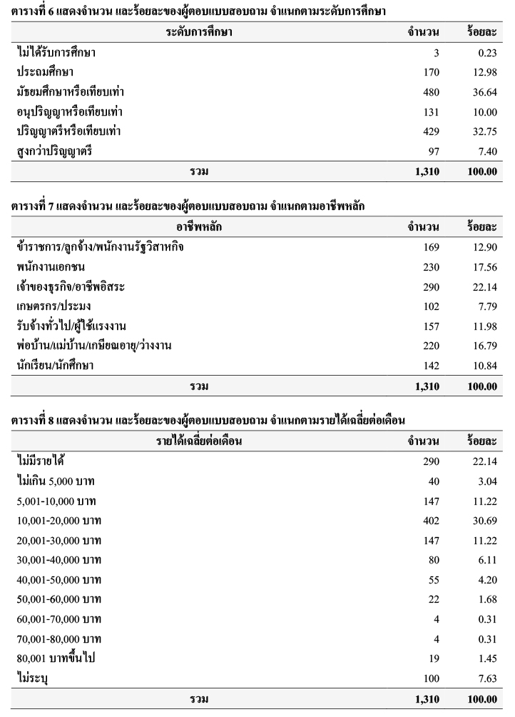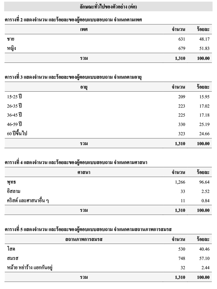 เมื่อพิจารณาลักษณะทั่วไปของตัวอย่าง พบว่า ตัวอย่าง ร้อยละ 8.47 มีภูมิลำเนาอยู่กรุงเทพฯ ร้อยละ 18.70 มีภูมิลำเนาอยู่ภาคกลาง ร้อยละ 17.71 มีภูมิลำเนาอยู่ภาคเหนือ ร้อยละ 33.28 มีภูมิลำเนาอยู่ภาคตะวันออกเฉียงเหนือ ร้อยละ 13.98 มีภูมิลำเนาอยู่ภาคใต้ และร้อยละ 7.86 มีภูมิลำเนาอยู่ภาคตะวันออก โดยตัวอย่าง ร้อยละ 48.17 เป็นเพศชาย และร้อยละ 51.83 เป็นเพศหญิง ตัวอย่าง ร้อยละ 15.95 อายุ 15-25 ปี ร้อยละ 17.02 อายุ 26-35 ปี ร้อยละ17.18 อายุ 36-45 ปี ร้อยละ 25.19 อายุ 46-59 ปี และร้อยละ 24.66 อายุ 60 ปีขึ้นไป โดยตัวอย่าง ร้อยละ 96.64 นับถือศาสนาพุทธ ร้อยละ 2.52 นับถือศาสนาอิสลาม และร้อยละ 0.84 นับถือศาสนาคริสต์ และศาสนาอื่น ๆ