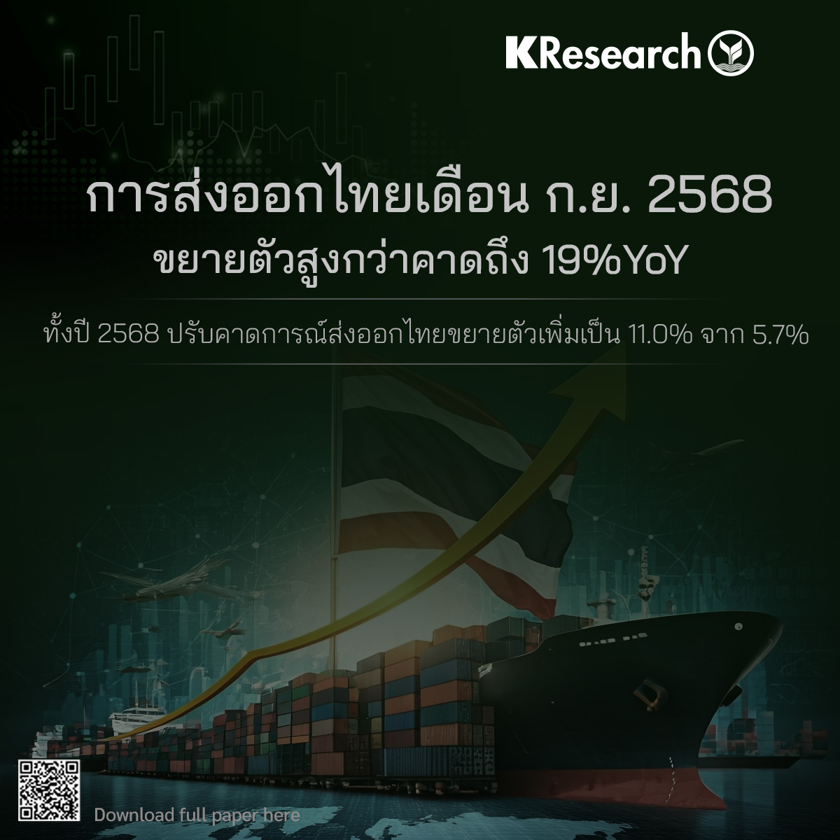 • ศูนย์วิจัยกสิกรไทยปรับประมาณการภาพรวมการส่งออกไทยขยายตัวเพิ่มขึ้นเป็น 11.0% จากเดิมที่คาดการณ์ไว้ 5.7% ในปี 2568 จากตัวเลขการส่งออกในเดือนก.ย. ที่ออกมาดีกว่าคาด และมุมมองการส่งออกในไตรมาส 4/2568 ที่ปรับดีขึ้น เนื่องจากการส่งออกอิเล็กทรอนิกส์ที่คาดว่าจะยังเร่งตัวต่อเนื่อง