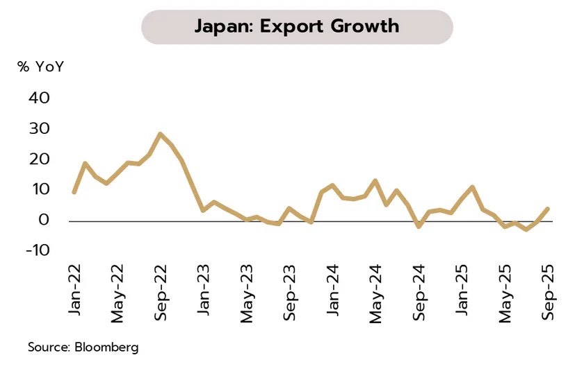 นโยบายการคลังเชิงรุกของรัฐบาลทาคาอิจิคาดช่วยหนุนเศรษฐกิจญี่ปุ่นช่วงปลายปี การส่งออกของญี่ปุ่นพลิกฟื้นจากหดตัวในเดือนก่อนที่ -0.1% กลับมาขยายตัว 4.2% YoY ในเดือนกันยายน ด้านอัตราเงินเฟ้อทั่วไป (National CPI) เดือนกันยายนปรับเพิ่มขึ้นครั้งแรกในรอบ 8 เดือน อยู่ที่ 2.9% YoY แต่สอดคล้องกับตลาดคาดการณ์ ขณะที่ดัชนี PMI ภาคการผลิตหดตัวมากขึ้นจากเดือนก่อนที่ 48.5 สู่ระดับ 48.3 ในเดือนตุลาคม