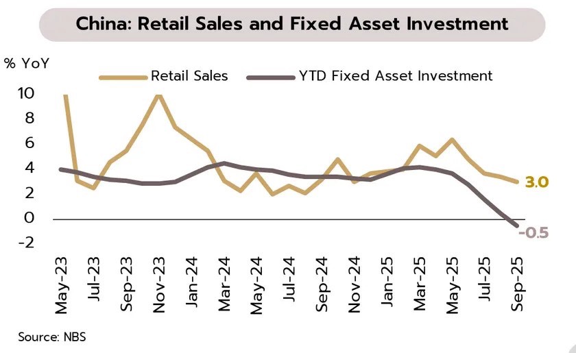 เครื่องชี้ด้านการบริโภคและการลงทุนชะลอตัวต่อเนื่อง ภาคอสังหาฯ ยังคงอ่อนแอ อีกทั้งการส่งออกมีบทบาทน้อยลงในการขับเคลื่อนเศรษฐกิจ โดย contribution to GDP growth ของการส่งออกสุทธิลดลงจาก 46% ในไตรมาสที่ 4 ปี 2567 เหลือ 25% ในไตรมาสที่ 3 ปี 2568 นอกจากนี้ จีนเผชิญความเสี่ยงมากขึ้นจากภาษีสวมสิทธิ์ของสหรัฐฯ การควบคุมการส่งออกสินค้าสำคัญ และการขึ้นค่าธรรมเนียมท่าเรือ ดังนั้น ความหวังสำคัญในการกระตุ้นเศรษฐกิจจีนจึงขึ้นอยู่กับประสิทธิผลในการฟื้นการบริโภคภายในประเทศทั้งจากมาตรการอุดหนุนการแลกซื้อสินค้าใหม่ประกอบกับมาตรการหนุนการบริโภคในภาคบริการ