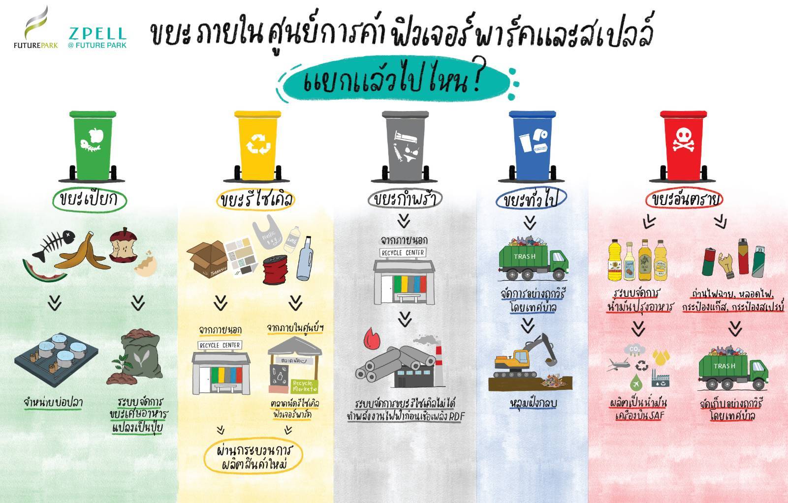 ดร.สุชาย วัชอภัยกุล ยังกล่าวต่อว่า ทั้งนี้ขยะทุกประเภทจะได้รับการจัดเก็บและส่งต่อแบบถูกสุขลักษณะอย่างเป็นระบบ มีการจัดตั้งถังขยะแยกประเภทภายในพื้นที่ส่วนกลางของศูนย์การค้าฯ ให้ลูกค้าได้มีส่วนร่วมในการแยกขยะตั้งแต่ต้นทาง เพื่อส่งต่อไปยังห้องขยะที่ได้จัดตั้งขึ้นบริเวณอาคารจอดรถฟิวเจอร์พาร์ค ชั้น B ฝั่งอีสต์  ไม่ว่าจะเป็น ขยะอินทรีย์ จะถูกนำกลับมาใช้ประโยชน์ ผ่านโครงการ Green from Waste เปลี่ยนขยะอินทรีย์เป็นปุ๋ยคืนสู่ธรรมชาติ โดยร่วมกับบริษัท Oklin ติดตั้งเครื่องย่อยเศษอาหาร (Food Waste Composter) ที่สามารถผลิตปุ๋ยอินทรีย์ได้เฉลี่ย 75 กิโลกรัมต่อวัน หรือกว่า 2 ตันต่อเดือน ซึ่งปุ๋ยที่ได้จะถูกนำไปใช้บำรุงต้นไม้ภายในพื้นที่ของศูนย์การค้าฟิวเจอร์พาร์ค สเปลล์ และ ฟิวเจอร์ ซิตี้ รวมถึงมอบให้ลูกค้าในกิจกรรมรักษ์โลก ตลอดจนส่งต่อให้ชุมชนรอบข้าง เพื่อสร้างวงจรขยะให้กลับมาสร้างคุณค่าใหม่อย่างยั่งยืน นอกจากนี้ เศษอาหารส่วนเกินจากกระบวนการย่อยอย่างถูกวิธีจะถูกนำไปเป็นอาหารปลา คืนคุณค่าให้ระบบนิเวศอย่างสมบูรณ์อีกด้วย ขณะที่ ขยะรีไซเคิล ทางศูนย์ฯ ได้จัด ตลาดนัดรีไซเคิล (Recycle Market) เพื่อร่วมขับเคลื่อนเศรษฐกิจหมุนเวียน เปิดพื้นที่ให้ร้านค้าภายในศูนย์ฯ นำวัสดุเหลือใช้ที่สามารถใช้ประโยชน์ต่อได้ เช่น กล่องกระดาษ พลาสติก แก้ว หรือโลหะ มาจำหน่ายให้ผู้ประกอบการจากภายนอกรับซื้อโดยตรงทุกวันจันทร์ พุธ และศุกร์ ซึ่งสามารถช่วยสร้างรายได้เพิ่มให้กับร้านค้า ลดปริมาณขยะฝังกลบ และเชื่อมโยงภาคธุรกิจเข้ากับการจัดการขยะในระดับชุมชน ตามแนวคิด Circular Economy ให้เกิดขึ้นจริงภายในพื้นที่ศูนย์การค้า ทั้งนี้ในส่วนของขยะทั่วไป ขยะอันตราย และขยะติดเชื้อ จะถูกส่งต่อให้เทศบาลนครรังสิต จัดการอย่างถูกวิธีตามมาตรฐานสิ่งแวดล้อมต่อไป