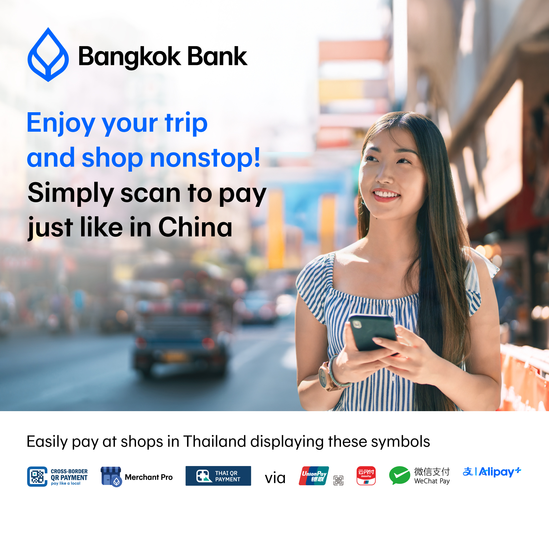 ธนาคารกรุงเทพ พร้อมอำนวยความสะดวกแก่นักท่องเที่ยวจีนที่เดินทางมายังประเทศไทย สแกนจ่ายค่าสินค้า และบริการได้ทันที ผ่าน 3 แอปฯยอดนิยม UnionPay, Weixin Pay และ Alipay ณ ร้านค้าธนาคารกรุงเทพกว่า 1.9 ล้านร้านค้าทั่วประเทศ ปลอดภัย ได้อัตราแลกเปลี่ยนแบบเรียลไทม์ ไม่มีค่าธรรมเนียม ตอกย้ำบทบาท “ธนาคารชั้นนำระดับภูมิภาค” เชื่อมต่อทุกโอกาสการใช้จ่ายแบบไร้รอยต่อ เริ่มตั้งแต่วันที่ 30 ตุลาคม 2568 นี้