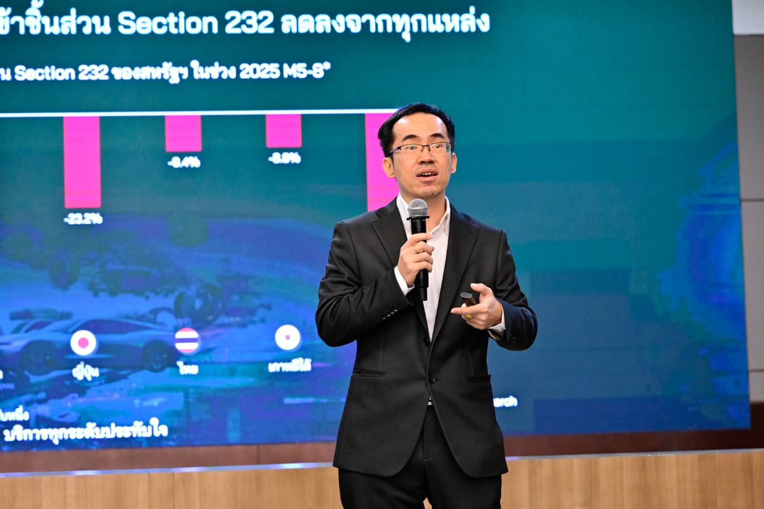 ดร.รุจิพันธ์ อัสสะรัตน์ ผู้ช่วยกรรมการผู้จัดการ บริษัท ศูนย์วิจัยกสิกรไทย จำกัด เผยว่า แม้ไทยมีสัดส่วนส่งออกรถยนต์ไปสหรัฐฯ น้อย แต่มาตรการภาษีนำเข้า Section 232 มีแนวโน้มส่งผลกระทบทางอ้อมต่อส่งออกรถยนต์ไทยไปตลาดโลก เพราะผู้ผลิตรายใหญ่ เช่น ญี่ปุ่นและเกาหลีใต้ อาจกระจายส่งออกไปตลาดอื่นมากขึ้น เพื่อลดการพึ่งพาสหรัฐฯ ซึ่งจะเพิ่มความรุนแรงของการแข่งขันในตลาดโลก ขณะเดียวกัน มาตรการนี้กระทบโดยตรงต่อการส่งออกชิ้นส่วนไทยไปสหรัฐฯ โดยมีสัดส่วนราว 26% ของมูลค่าส่งออกชิ้นส่วนไทย อย่างไรก็ดี ยางล้อขนาดเล็กของไทยยังได้เปรียบในด้านต้นทุนและคุณภาพ นอกจากนี้ ไทยยังได้รับการยกเว้นภาษี Section 232 ตามมาตรการ Import Adjustment Offset ราว 12% ของมูลค่าส่งออกชิ้นส่วน (ไม่รวมยางล้อ) ไปสหรัฐฯ มากกว่าญี่ปุ่นที่อยู่เพียง 3%