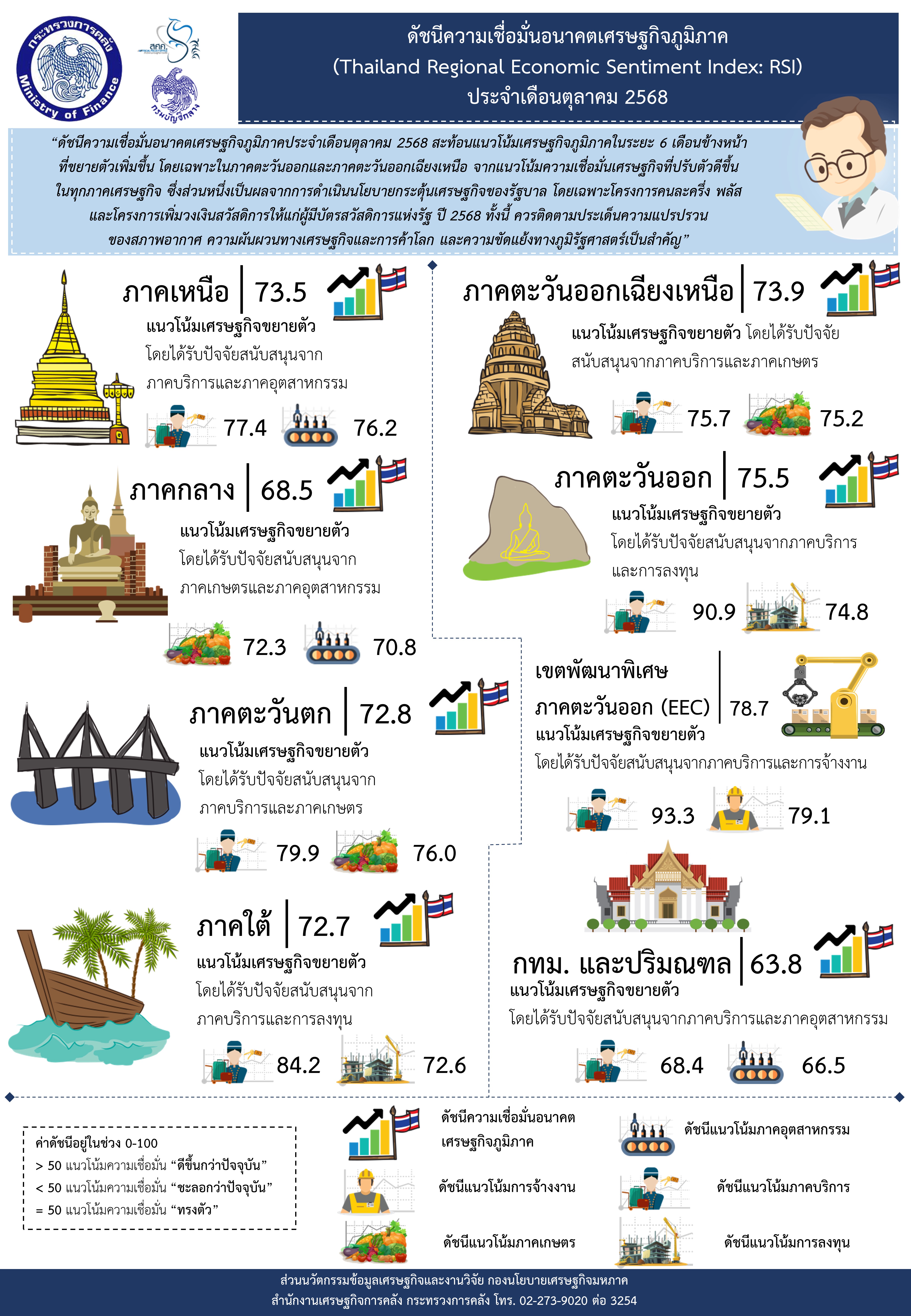 “ดัชนีความเชื่อมั่นอนาคตเศรษฐกิจภูมิภาคประจำเดือนตุลาคม 2568 สะท้อนแนวโน้มเศรษฐกิจภูมิภาคในระยะ 6 เดือนข้างหน้าที่ขยายตัวเพิ่มขึ้น โดยเฉพาะในภาคตะวันออกและภาคตะวันออกเฉียงเหนือ จากแนวโน้มความเชื่อมั่นเศรษฐกิจที่ปรับตัวดีขึ้นในทุกภาคเศรษฐกิจ ซึ่งส่วนหนึ่งเป็นผลจากการดำเนินนโยบายกระตุ้นเศรษฐกิจของรัฐบาล โดยเฉพาะโครงการคนละครึ่ง พลัส และโครงการเพิ่มวงเงินสวัสดิการให้แก่ ผู้มีบัตรสวัสดิการแห่งรัฐ ปี 2568 ทั้งนี้ ควรติดตามประเด็นความแปรปรวนของสภาพอากาศ ความผันผวนทางเศรษฐกิจและการค้าโลก และความขัดแย้งทางภูมิรัฐศาสตร์เป็นสำคัญ”