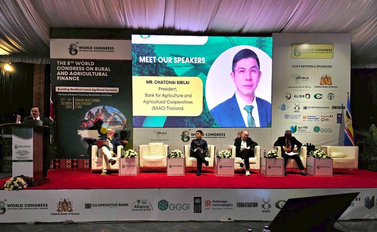 นายฉัตรชัย ศิริไล ผู้จัดการธนาคารเพื่อการเกษตรและสหกรณ์การเกษตร (ธ.ก.ส.) ในฐานะรองประธานสมาคมสินเชื่อการเกษตรและชนบทแห่งภาคพื้นเอเชียและแปซิฟิก (Asia-Pacific Rural and Agricultural Credit Association : APRACA) พร้อมด้วยนายเกรียงไกร กัลหะรัตน์ รองผู้จัดการ ธ.ก.ส. นางสาวพรหมกร พรหมขัตแก้ว ผู้ช่วยผู้จัดการ ธ.ก.ส. และคณะผู้บริหาร เข้าร่วมการประชุม World Congress on Rural and Agricultural Finance ครั้งที่ 8 ณ โรงแรม Sarova Whitesands Hotel & Resort เมืองมอมบาซา สาธารณรัฐเคนยา ระหว่างวันที่ 28 - 30 ตุลาคม 2568 ในหัวข้อ Building Resilient Local Agrifood Systems: The Role of Robust Financing Mechanism and Policy