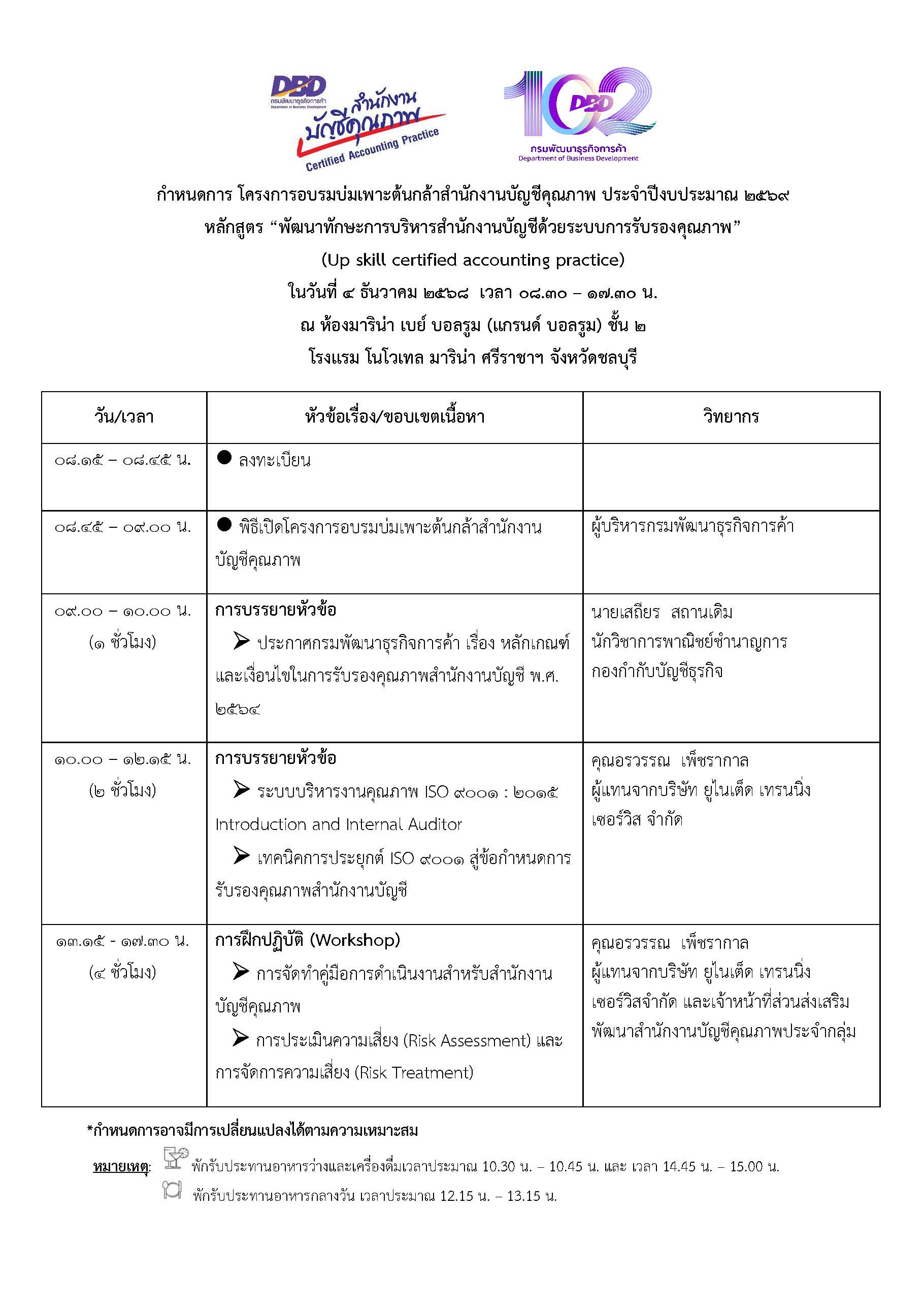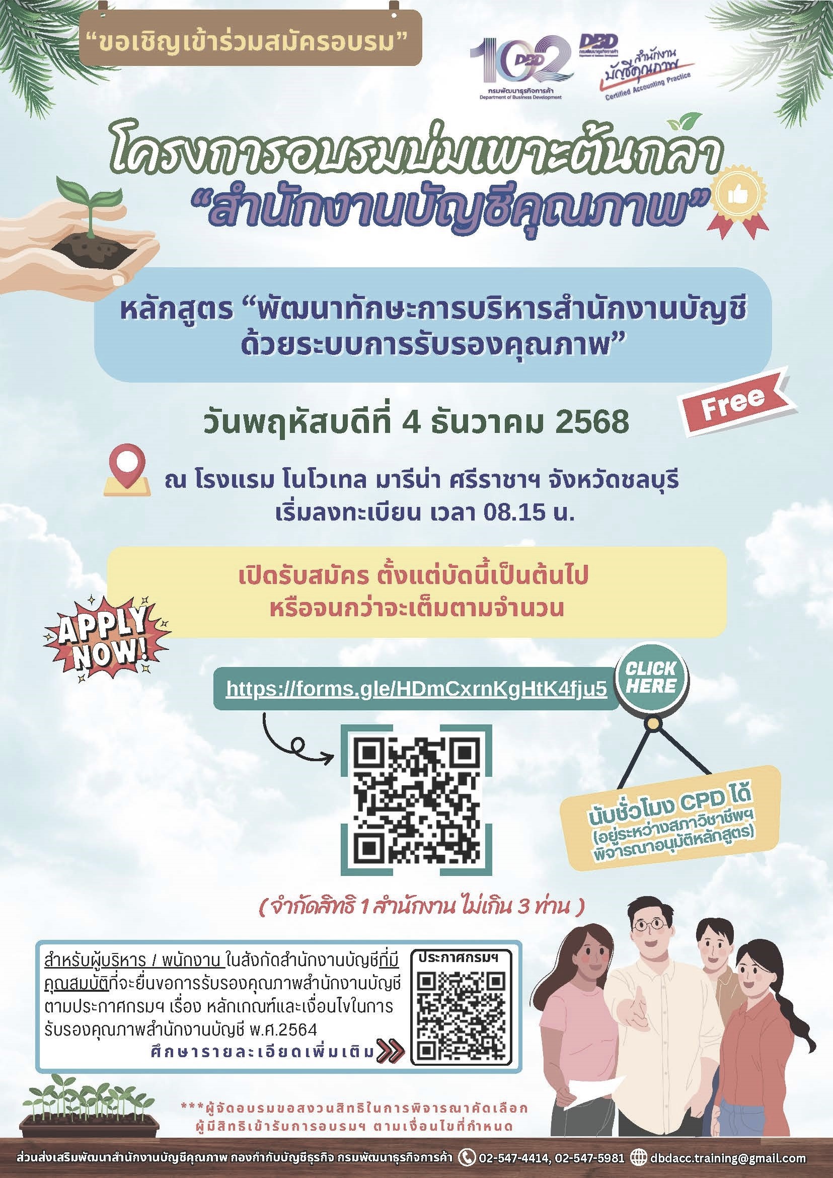 เพื่อเป็นการพัฒนาสำนักงานบัญชีและผู้ประกอบวิชาชีพบัญชีให้มีความรู้ความเข้าใจเกี่ยวกับข้อกำหนดการรับรองคุณภาพสำนักงานบัญชี รวมทั้งองค์ความรู้ต่างๆ ที่จำเป็นในการดำเนินธุรกิจ กรมฯ จึงได้จัดทำโครงการอบรมบ่มเพาะต้นกล้าสำนักงานบัญชีคุณภาพ ประจำปีงบประมาณ 2569 โดยเป็นการอบรมให้ความรู้ในรูปแบบการบรรยาย แบ่งกลุ่มฝึกปฏิบัติ (Workshop) และนำเสนอผลงานรวม 7 ชั่วโมง และสามารถนับเป็นชั่วโมง CPD ได้ด้วย กำหนดจัดอบรมในวันที่ 4 ธันวาคม 2568 ณ โรงแรม โนโวเทล มาริน่า ศรีราชาฯ จังหวัดชลบุรี โดยมีเนื้อหาเกี่ยวกับ 1) ประกาศกรมพัฒนาธุรกิจการค้า เรื่อง หลักเกณฑ์และเงื่อนไขในการรับรองคุณภาพสำนักงานบัญชี พ.ศ. 2564 และเทคนิคการบริหารสำนักงานบัญชี ด้วยระบบการรับรองคุณภาพ โดยวิทยากรจากภาครัฐ จำนวน 1 ชั่วโมง 2) การบรรยายเกี่ยวกับข้อกำหนดการรับรองคุณภาพสำนักงานบัญชีและแบ่งกลุ่มฝึกปฏิบัติ (Workshop) แนวทางการเขียนคู่มือการดำเนินงานสำนักงานบัญชีคุณภาพ และเทคนิคการประยุกต์ ISO 9001 สู่ข้อกำหนดการรับรองคุณภาพสำนักงานบัญชี โดยวิทยากรจากภาคเอกชน จำนวน 6 ชั่วโมง