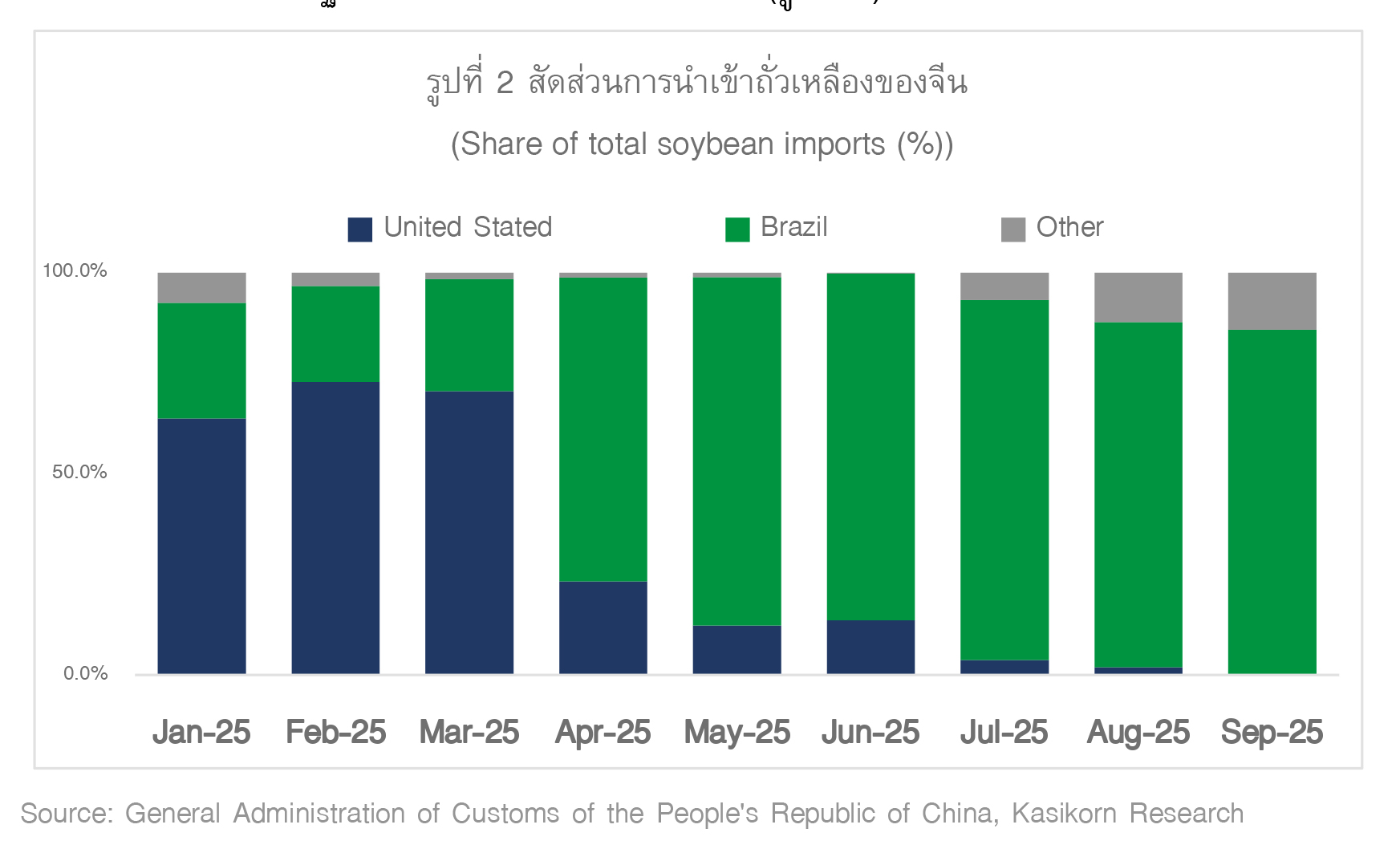 1. จีนจะกลับมานำเข้าถั่วเหลืองจากสหรัฐฯ ทันที แต่ไม่ได้ระบุถึงจำนวนหรือรายละเอียดอื่น ๆ เพิ่มเติม ทั้งนี้ จีนได้ทยอยลดการนำเข้าถั่วเหลืองจากสหรัฐฯ มาตั้งแต่เดือนเม.ย. 2025 และหยุดนำเข้าถั่วเหลืองจากสหรัฐฯ ในเดือนก.ย.2025 ที่ผ่านมา (รูปที่ 2)