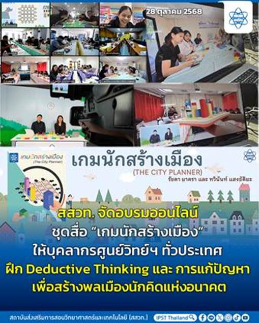 สถาบันส่งเสริมการสอนวิทยาศาสตร์และเทคโนโลยี (สสวท.) เดินหน้าพัฒนาทักษะการคิดเชิงตรรกะและเหตุผลให้แก่ผู้เรียน ผ่านการอบรมออนไลน์ชุดสื่อใหม่ล่าสุด "เกมนักสร้างเมือง" (THE CITY PLANNER) ให้แก่บุคลากรศูนย์วิทยาศาสตร์เพื่อการศึกษาทั่วประเทศ โดยวิทยาการ คือนางสาวรัชดา ยาตรา และนางสาวทวินันท์ แสงขัติยะ จากฝ่ายโอลิมปิกวิชาการและอัจฉริยภาพ สสวท. เมื่อวันอังคารที่ 28 ตุลาคม 2568
