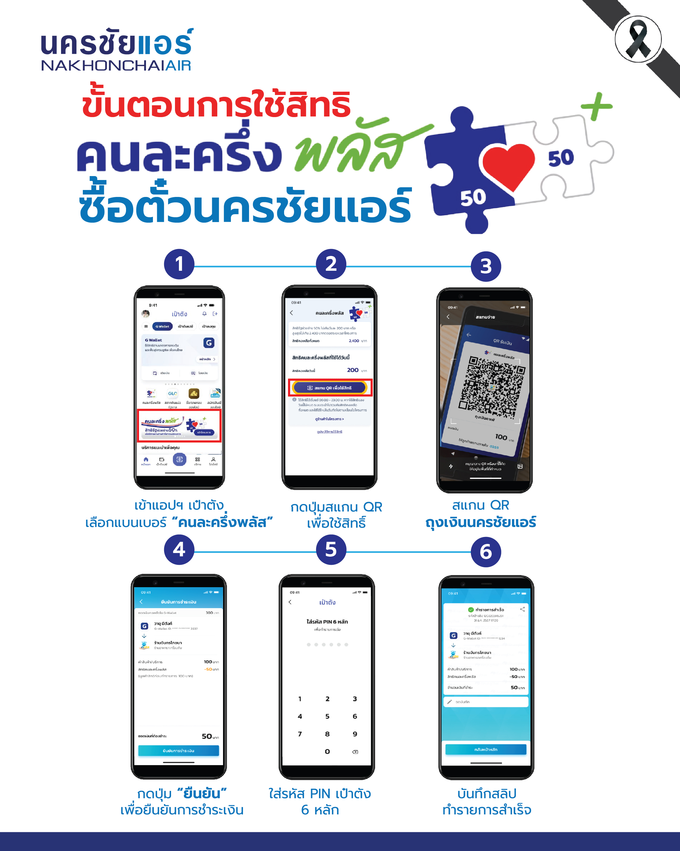 สำหรับขั้นตอนการใช้สิทธิ์ซื้อตั๋วนครชัยแอร์ คนละครึ่งพลัส ผ่านแอพพลิเคชั่นเป๋าตัง ลูกค้าต้องแจ้งพนักงานหน้าเคาน์เตอร์ทำรายการก่อนซื้อตั๋ว ว่าต้องการใช้สิทธิ์ “คนละครึ่งพลัส” แล้วทำรายการซื้อตั๋วตามเส้นทางและเที่ยวเวลาที่ต้องการ จากนั้นให้ลูกค้าเข้าแอพพลิเคชั่นเป๋าตัง กดเข้าหน้าหลัก “คนละครึ่งพลัส” แล้วกดสแกนคิวอาร์โค้ดที่ได้รับจากพนักงานหน้าเคาน์เตอร์ เพื่อใช้สิทธิ์ หลังจากสแกนแล้วหน้าจอจะแสดงยอดค่าโดยสารทั้งหมด ให้ลูกค้าตรวจสอบข้อมูลแล้วกดยืนยันการชำระเงิน ระบบจะแสดงสลิปหลักฐานการใช้สิทธิ์ โดยให้ลูกค้าแสดงต่อพนักงานที่ทำรายการเพื่อรับตั๋วโดยสาร