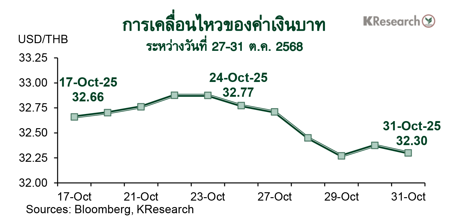 •ในวันศุกร์ที่ 31 ต.ค. 2568 เงินบาทปิดตลาดในประเทศที่ 32.30 บาทต่อดอลลาร์ฯ เทียบกับระดับ 32.77 บาทต่อดอลลาร์ฯ ในวันศุกร์ก่อนหน้า (24 ต.ค.) สำหรับสถานะพอร์ตการลงทุนของนักลงทุนต่างชาติระหว่างวันที่ 27-31 ต.ค. 2568 นั้น นักลงทุนต่างชาติขายสุทธิหุ้นไทย 5,045 ล้านบาท และมีสถานะอยู่ในฝั่ง Net Inflows เข้าตลาดพันธบัตรไทย 30,483 ล้านบาท (ซื้อสุทธิพันธบัตร 30,498 ล้านบาท หักตราสารหนี้หมดอายุ 15 ล้านบาท)