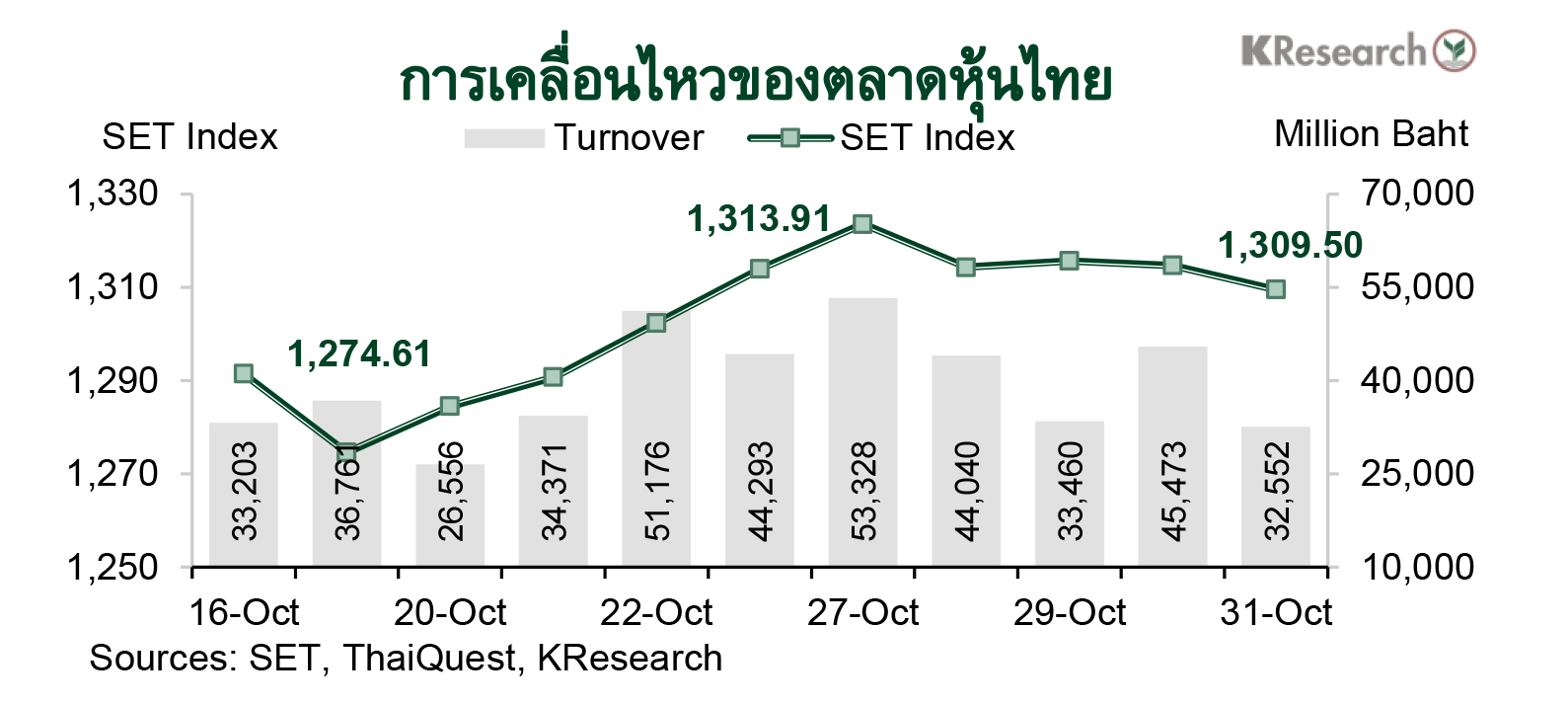 •สัปดาห์ถัดไป (3-7 พ.ย. 68) บริษัทหลักทรัพย์กสิกรไทย จำกัด มองว่า ดัชนีหุ้นไทยมีแนวรับที่ 1,300 และ 1,285 จุด ขณะที่แนวต้านอยู่ที่ 1,330 และ 1,345 จุด ตามลำดับ โดยศูนย์วิจัยกสิกรไทยประเมินปัจจัยสำคัญที่ต้องติดตาม ได้แก่ ถ้อยแถลงของเจ้าหน้าที่เฟด ตัวเลขเงินเฟ้อเดือนต.ค. ของไทย ผลประกอบการไตรมาส 3/2568 ของบจ.ไทย สถานการณ์ชัตดาวน์ในสหรัฐฯ และทิศทางเงินทุนต่างชาติ ขณะที่ปัจจัยเศรษฐกิจต่างประเทศอื่น ๆ ได้แก่ ข้อมูลการจ้างงานภาคเอกชนของ ADP เดือนต.ค. ของสหรัฐฯ ดัชนี PMI ภาคการผลิตและการบริการเดือนต.ค. ของสหรัฐฯ ยูโรโซน จีน และญี่ปุ่น ยอดค้าปลีกและดัชนีราคาผู้ผลิตเดือนก.ย. ของยูโรโซน ตลอดจนตัวเลขการส่งออกเดือนต.ค. ของจีน