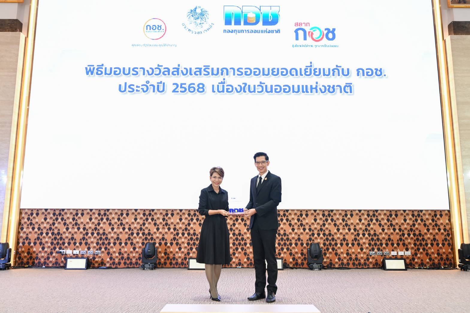 นางกชปภัทร บุญเทียมทัด ผู้อำนวยการฝ่ายเงินฝาก เป็นผู้แทนธนาคารเพื่อการเกษตรและสหกรณ์การเกษตร (ธ.ก.ส.) เข้ารับโล่เกียรติคุณประเภทรางวัลระดับเครือข่ายที่มีผลการดำเนินงานดีเด่น และเป็นธนาคารของรัฐที่มียอดสมาชิกออมต่อเนื่องเพิ่มขึ้นสูงสุด เนื่องในงานวันออมแห่งชาติ ประจำปี 2568 จัดขึ้นโดยกระทรวงการคลัง และกองทุนการออมแห่งชาติ (กอช.) โดยมี ดร.เบญจรงค์ สุวรรณคีรี ผู้ช่วยรัฐมนตรีประจำกระทรวงการคลัง เป็นประธานมอบรางวัลครั้งนี้ เมื่อวันที่ 31 ตุลาคม 2568 ณ ห้องกำปั่นทอง ชั้น 21 อาคาร 150 ปี กระทรวงการคลัง กรุงเทพมหานคร