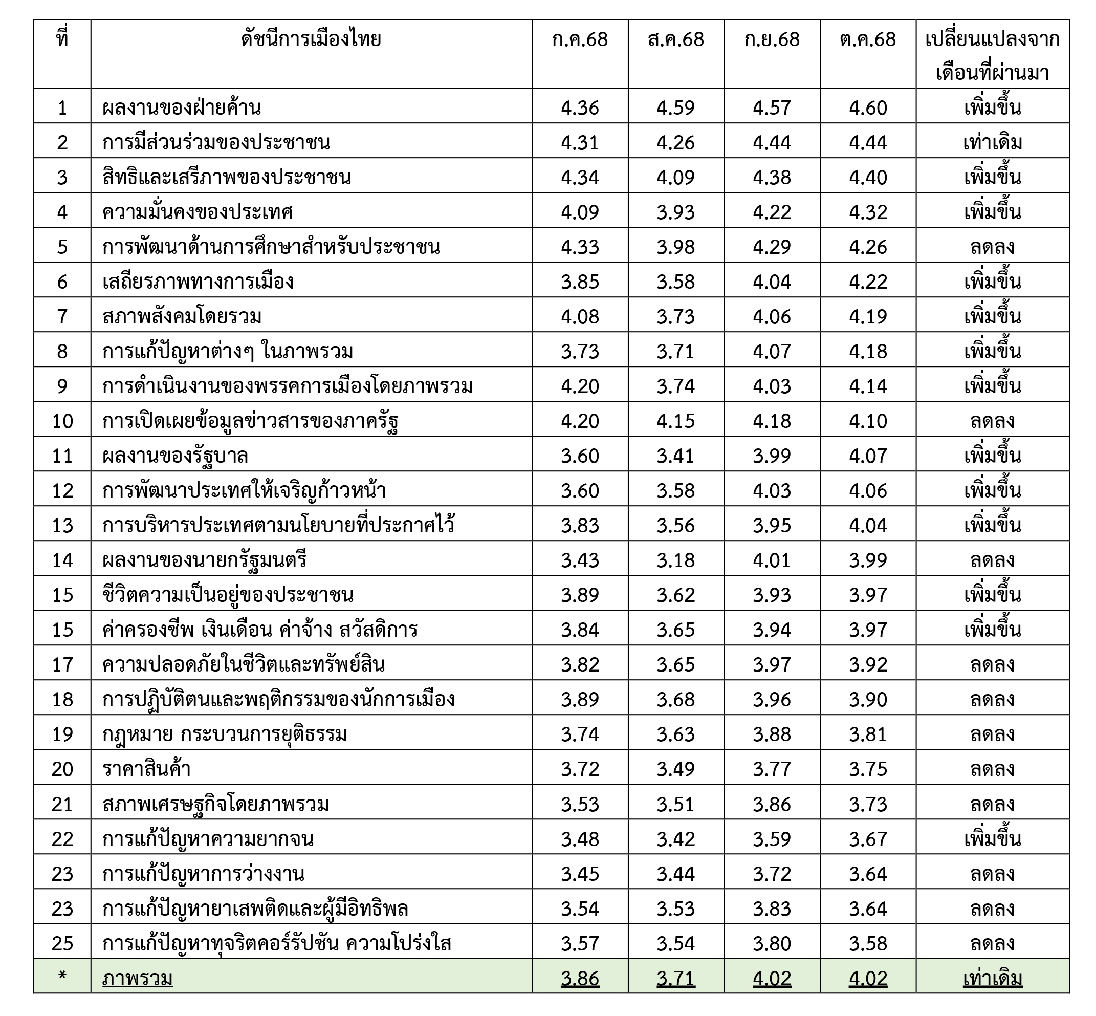 1. “ดัชนีการเมืองไทย” เดือนตุลาคม 2568 ภาพรวมคะแนนเต็ม 10 ได้ 4.02 คะแนน (เดือนกันยายน 2568 ได้ 4.02 คะแนน)