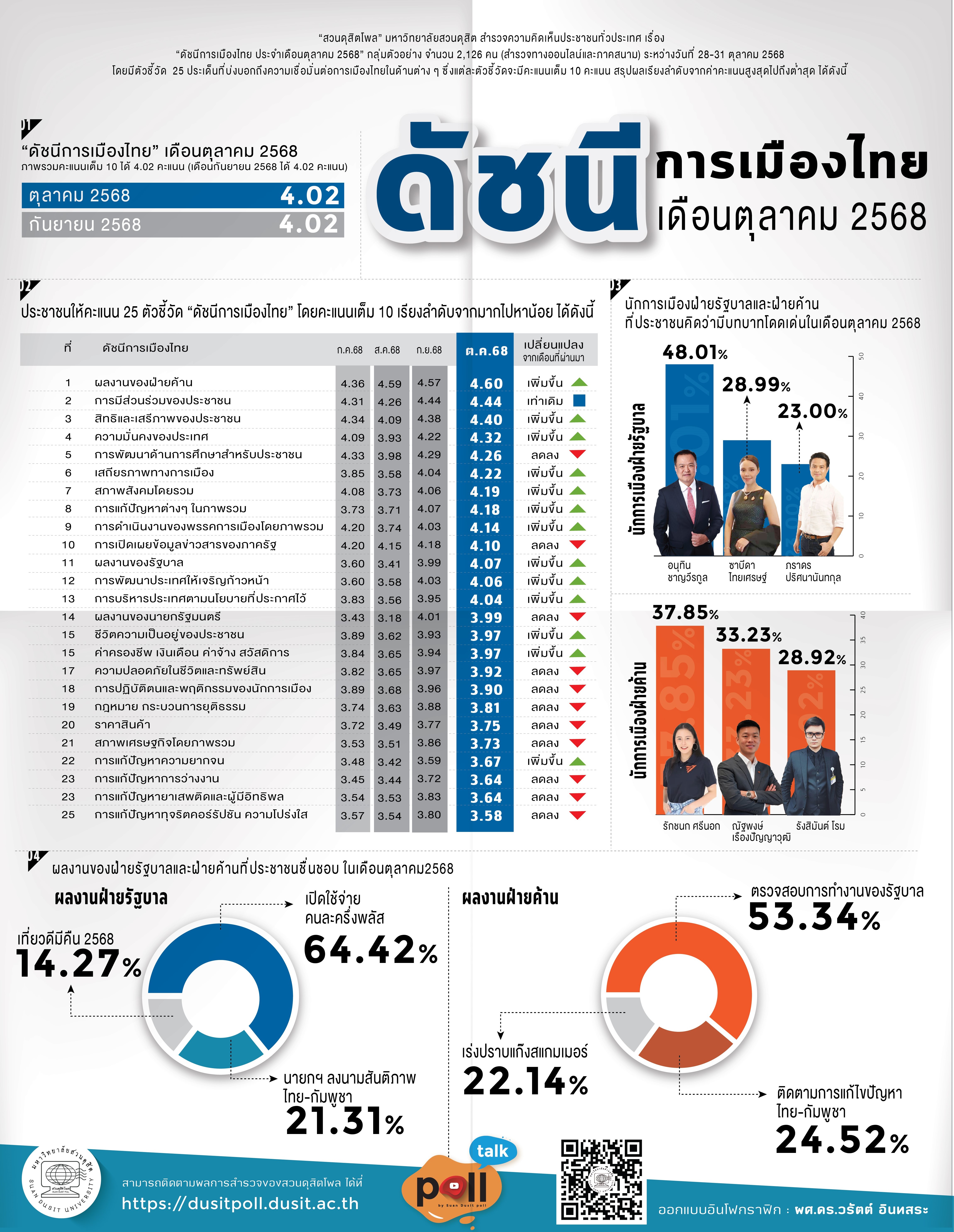 “สวนดุสิตโพล” มหาวิทยาลัยสวนดุสิต สำรวจความคิดเห็นประชาชนทั่วประเทศ เรื่อง “ดัชนีการเมืองไทย ประจำเดือนตุลาคม 2568” กลุ่มตัวอย่าง จำนวน 2,126 คน (สำรวจทางออนไลน์และภาคสนาม) ระหว่างวันที่ 28-31 ตุลาคม 2568 โดยมีตัวชี้วัด 25 ประเด็นที่บ่งบอกถึงความเชื่อมั่นต่อการเมืองไทยในด้านต่าง ๆ ซึ่งแต่ละตัวชี้วัดจะมีคะแนนเต็ม 10 คะแนน สรุปผลเรียงลำดับจาก ค่าคะแนนสูงสุดไปถึงต่ำสุด ได้ดังนี้