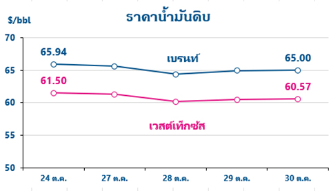 ราคาน้ำมันดิบมีแนวโน้มปรับลดลงเนื่องจากตลาดคาดผลกระทบจากมาตรการคว่ำบาตรของสหรัฐฯ ต่อรัสเซียถูกจำกัดด้วยอุปทานน้ำมันดิบที่ปรับเพิ่มขึ้นอย่างต่อเนื่องจากกลุ่มโอเปกพลัส ถึงแม้ว่าสถานการณ์การสู้รบระหว่างรัสเซียและยูเครนจะตึงเครียดขึ้น อย่างไรก็ดี ความต้องการใช้น้ำมันได้รับแรงหนุนภายหลังตลาดผ่อนคลายความตึงเครียดต่อการดำเนินนโยบายภาษีของสหรัฐฯ ต่อจีน ภายหลังการพูดคุยระหว่างสองผู้นำสหรัฐฯ และจีนเป็นครั้งแรกในช่วงวันที่ 30 ต.ค. 68 ที่ผ่านมา