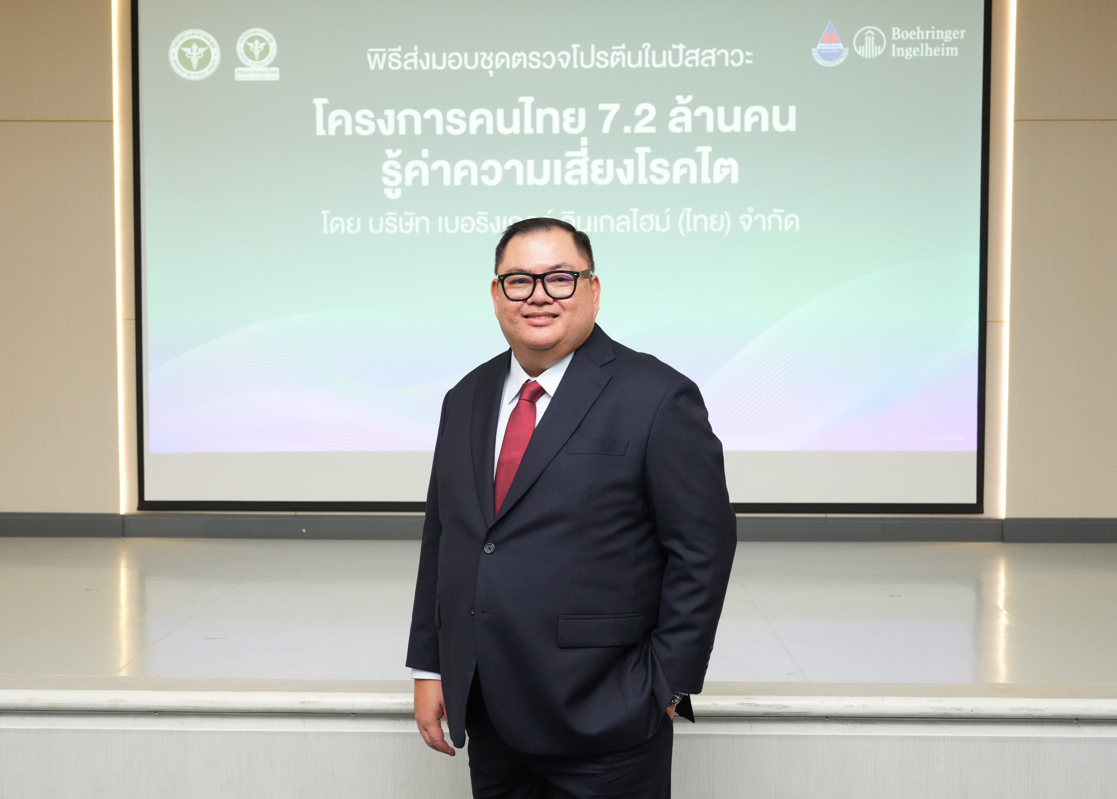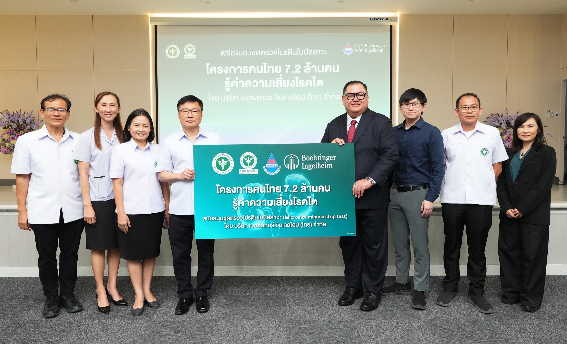 บริษัท เบอริงเกอร์ อินเกลไฮม์ (ไทย) จำกัด ตอกย้ำความมุ่งมั่นในการยกระดับสุขภาพคนไทยอย่างยั่งยืน ด้วยการส่งมอบชุดตรวจโปรตีนในปัสสาวะ (Microalbuminuria strip test) ให้แก่ กองโรคไม่ติดต่อ กรมควบคุมโรค กระทรวงสาธารณสุข และเขตสุขภาพต่าง ๆ ในประเทศไทย โดยจัดพิธีส่งมอบ ณ โรงพยาบาลพัทยาปัทมคุณ จังหวัดชลบุรี เพื่อสนับสนุนการดำเนินงานของโครงการ “คนไทย 7.2 ล้านคน รู้ค่าความเสี่ยงโรคไต” เพื่อเฉลิมพระเกียรติสมเด็จพระกนิษฐาธิราชเจ้า กรมสมเด็จพระเทพรัตนราชสุดาฯ สยามบรมราชกุมารี ในโอกาสทรงเจริญพระชนมายุ 72 พรรษา โดยมีเป้าหมายให้คนไทย 7.2 ล้านคน ได้รับการตรวจคัดกรองความเสี่ยงโรคไตตั้งแต่ระยะเริ่มต้น ลดภาระค่าใช้จ่ายในการรักษาโรคไต และชะลอการเกิดภาวะไตวายระยะสุดท้าย สอดคล้องกับแนวทางของแผนทศวรรษการป้องกันและชะลอไตเสื่อม พ.ศ. 2565–2574 ของกระทรวงสาธารณสุข ที่เน้นการดูแลสุขภาพเชิงป้องกันเพื่อลดภาระของโรคไตเรื้อรังในระยะยาว