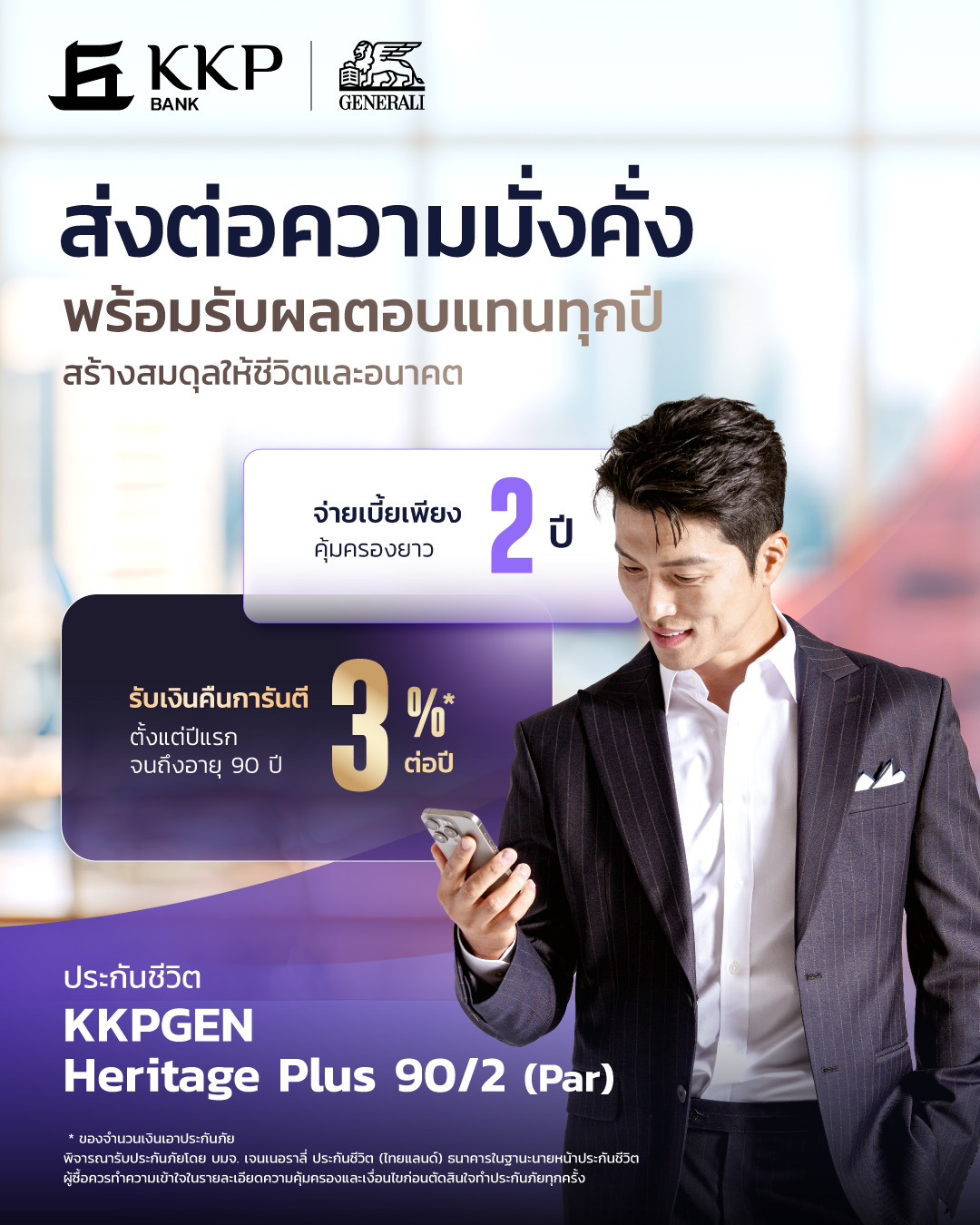 เจนเนอราลี่ ประกันชีวิต (ไทยแลนด์) ผนึกกำลัง ธนาคารเกียรตินาคินภัทร เปิดตัวผลิตภัณฑ์ใหม่ “KKPGEN Heritage Plus 90/2 (Par)” ประกันชีวิตที่ช่วยยกระดับการบริหารความมั่งคั่ง ด้วยการ “พลัส” อิสระทางการเงิน สร้างสมดุลให้ชีวิตและมรดก ชูจุดเด่นจ่ายเบี้ยสั้นเพียง 2 ปี รับความคุ้มครองสูงสุด 300% ของจำนวนเงินเอาประกันภัยควบคู่ผลตอบแทนระยะยาวเป็นเงินคืนการันตี 3% ของจำนวนเงินเอาประกันภัยต่อเนื่องทุกปีตั้งแต่ปีแรกจนถึงอายุ 90 ปี พร้อมโอกาสรับเงินปันผลรายปีเพื่อช่วยให้ลูกค้าสามารถวางแผนชีวิตและแผนมรดกได้อย่างยืดหยุ่น ใช้ชีวิตอย่างมั่นใจในวันนี้ และส่งต่อความมั่งคั่งให้คนที่รักได้อย่างมั่นคง