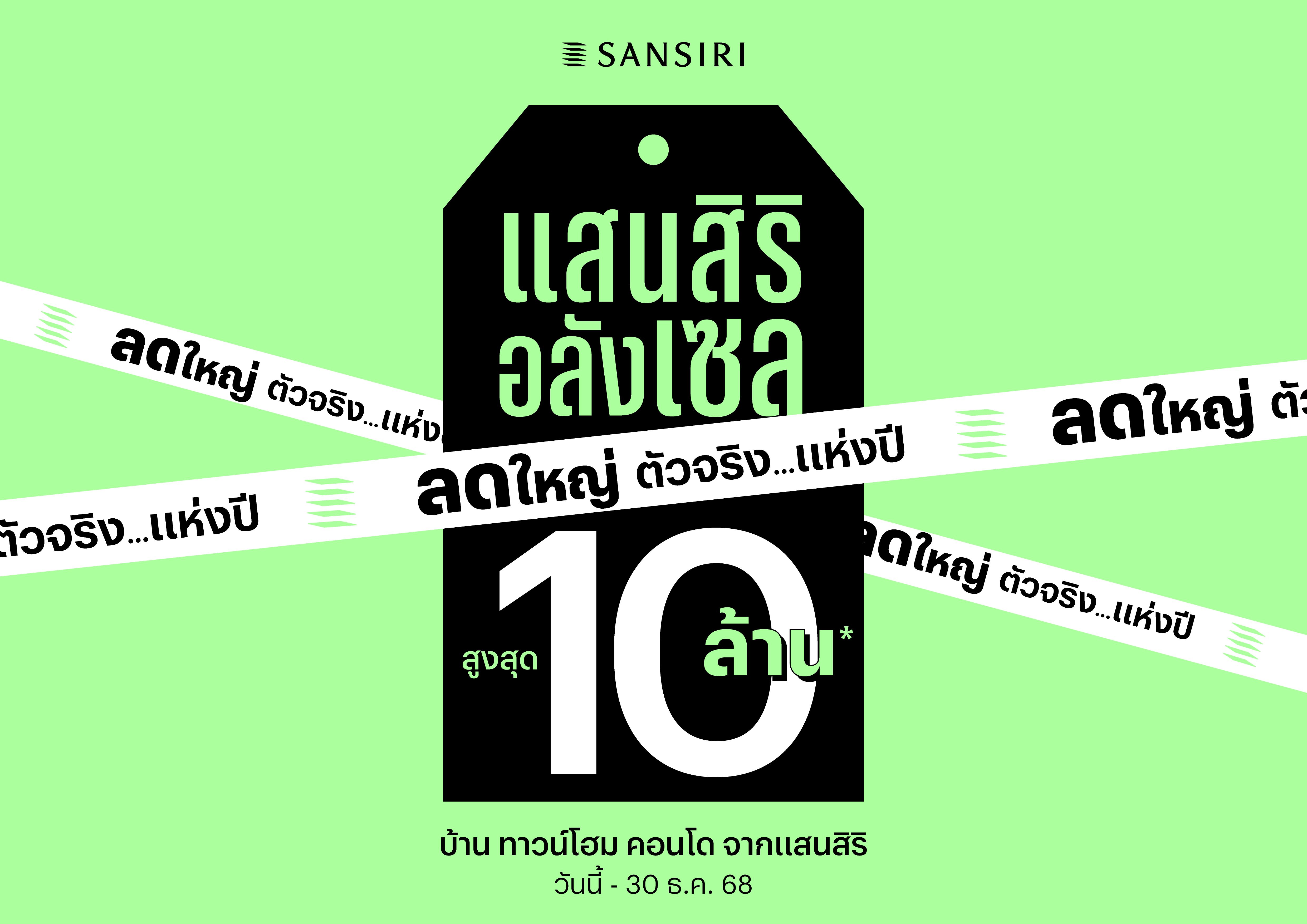 เพื่อตอบรับเสียงเรียกร้องจากลูกค้า แสนสิริ เดินหน้ามอบดีลใหญ่สุดพิเศษ ต่อเนื่องทันที กับ “แสนสิริ อลังเซล” ลดใหญ่ ตัวจริง…แห่งปี ลดสูงสุด 10 ล้านบาท* กับบ้าน คอนโดมิเนียม และทาวน์โฮม รวมกว่า 109 โครงการ ราคาพิเศษทุกยูนิต เริ่มต้น 8.9 แสน – 29.9 ล้านบาท พร้อมอัตราดอกเบี้ยจากธนาคารพันธมิตรชั้นนำ ผ่อนต่ำเริ่มต้นล้านละ 2,500 บาท* และโปรโมชันอื่นๆ อีกมากมาย เริ่มตั้งแต่ 3 พ.ย. – 30 ธ.ค. 68 ให้ทุกคนได้มีบ้านใหม่ต้อนรับปีใหม่ ด้วยข้อเสนอแห่งปี
