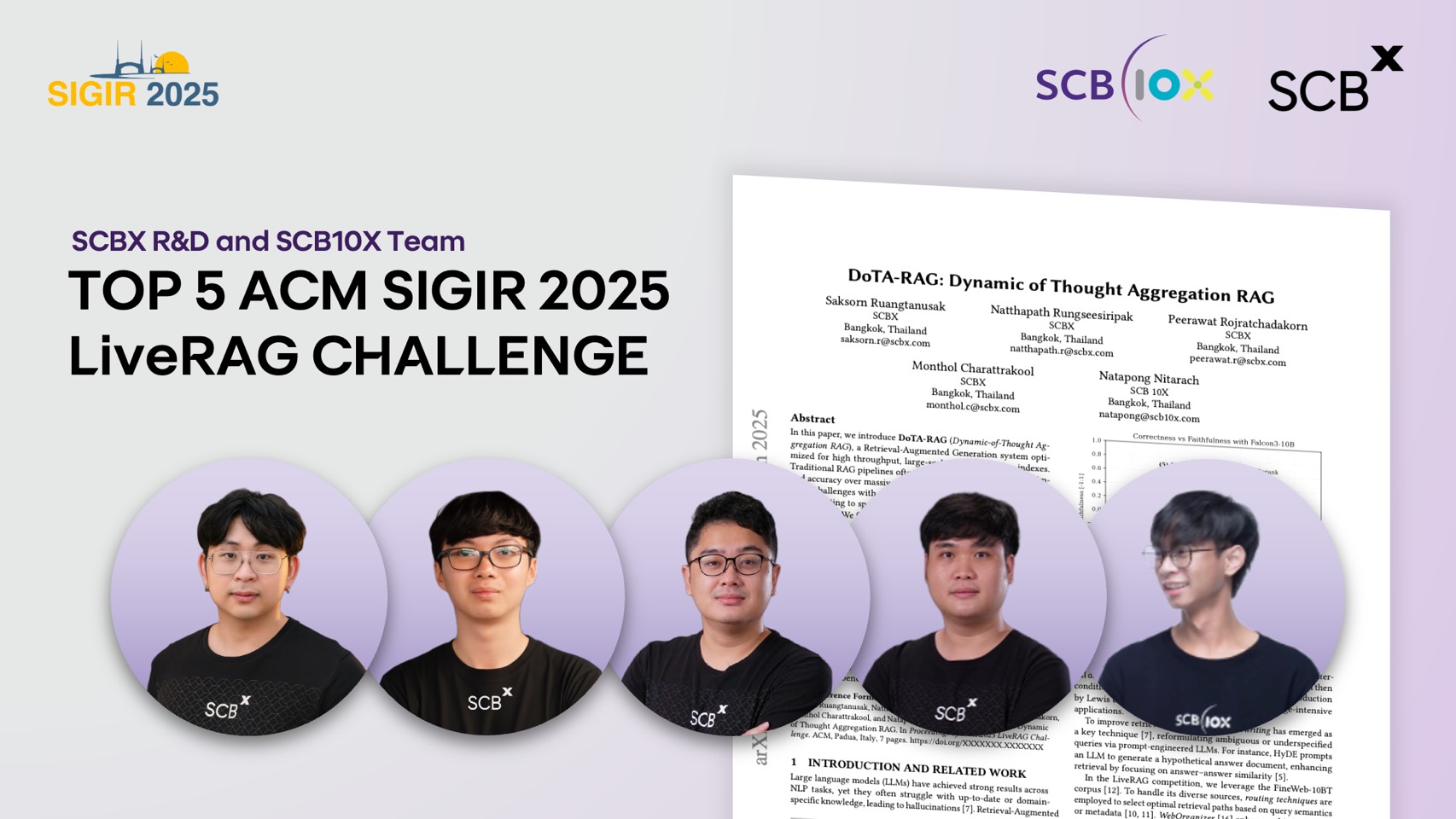 SCBX ประกาศความสำเร็จ คว้าอันดับ 5 จาก 40 ทีมทั่วโลก โดยเป็นทีมจากภาคอุตสาหกรรมที่ทำคะแนนสูงสุดในการแข่งขันพัฒนาระบบ Retrieval-Augmented Generation (RAG) ภายในงาน ACM SIGIR 2025 งานประชุมวิชาการด้าน Information Retrieval อันดับหนึ่งของโลกที่จัดต่อเนื่องมากว่า 48 ปี
