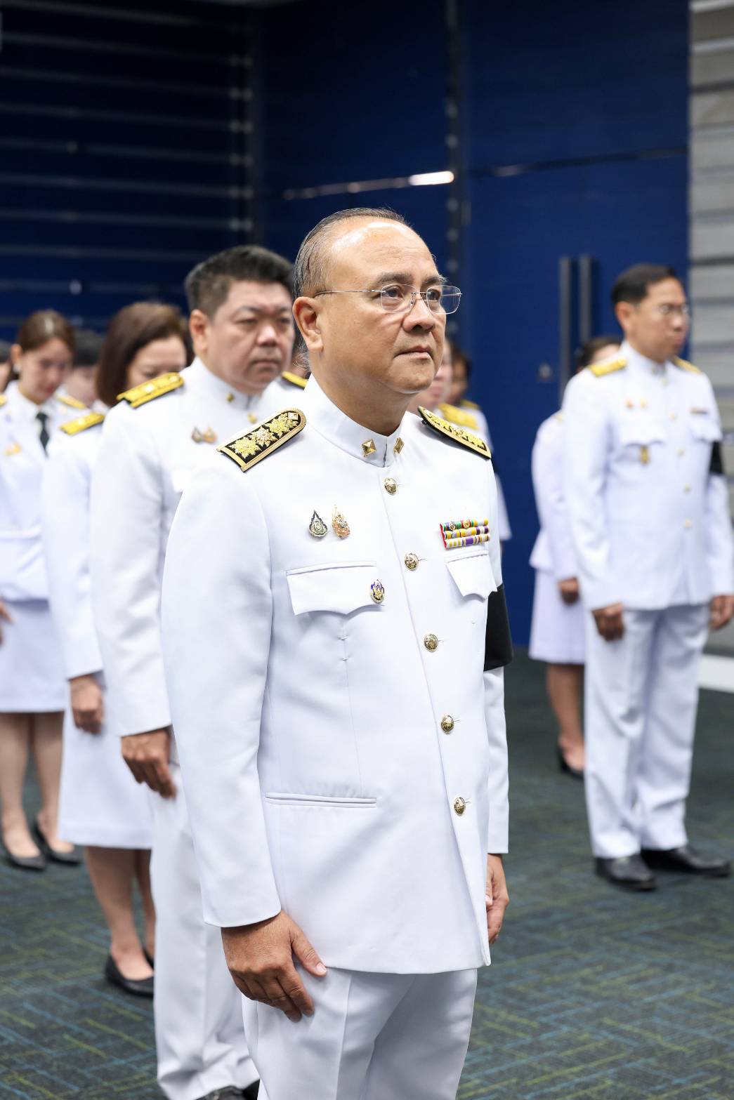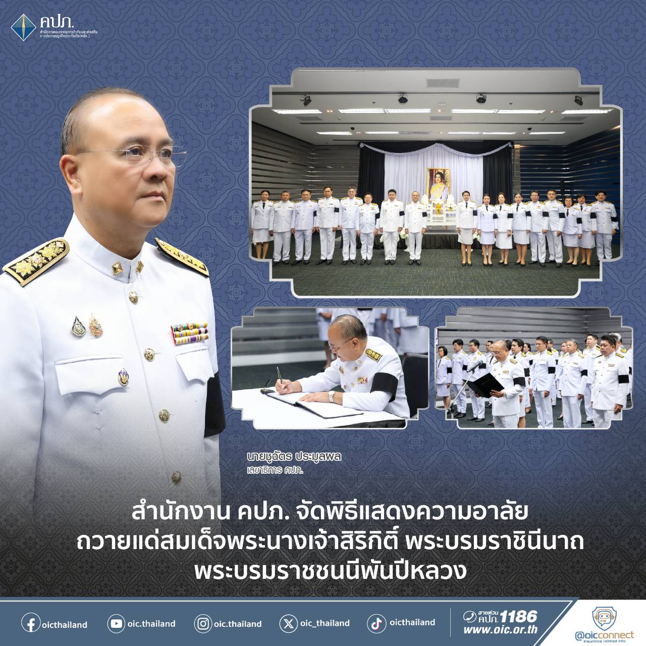 นายชูฉัตร ประมูลผล เลขาธิการ คณะกรรมการกำกับและส่งเสริมการประกอบธุรกิจประกันภัย (เลขาธิการ คปภ.) นำคณะผู้บริหาร และพนักงาน ร่วมพิธีแสดงความอาลัย ถวายแด่สมเด็จพระนางเจ้าสิริกิติ์ พระบรมราชินีนาถ พระบรมราชชนนี พันปีหลวง พร้อมยืนสงบนิ่งเป็นเวลา 93 วินาที และลงนามถวายความอาลัยเบื้องหน้าพระบรมฉายาลักษณ์ สมเด็จพระบรมราชินีนาถ พระบรมราชชนนีพันปีหลวง เพื่อแสดงความจงรักภักดีและน้อมสำนึกในพระมหากรุณาธิคุณอันหาที่สุดมิได้ ณ สำนักงาน คปภ. ถนนรัชดาภิเษก กรุงเทพมหานคร เมื่อวันที่ 3 พฤศจิกายน 2568