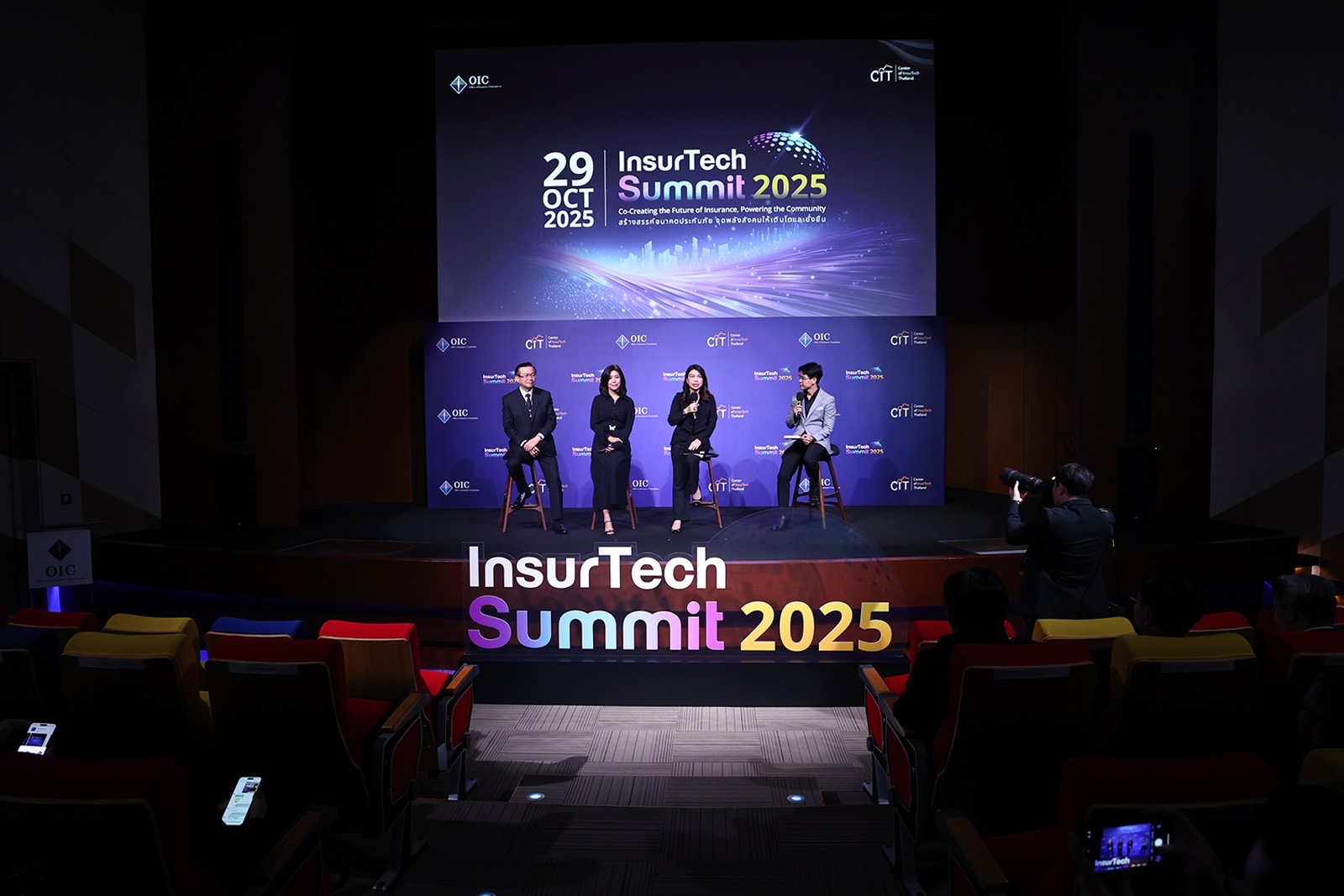 คุณนุสรา (อัสสกุล) บัญญัติปิยพจน์ นายกสมาคมประกันชีวิตไทย พร้อมด้วย ดร.สมพร สืบถวิลกุล นายกสมาคมประกันวินาศภัยไทย และคุณมยุรินทร์ สุทธิรัตนพันธ์ ผู้ทรงคุณวุฒิพิเศษ สำนักงาน คปภ. ร่วมเสวนาในหัวข้อ “Adapting Together : When Digital Is the Only Way Forward” ภายในงานสัมมนา InsurTech Summit 2025 ภายใต้แนวคิด “Co-creating the Future of Insurance, Powering the Community” (สร้างสรรค์อนาคตประกันภัย จุดพลังสังคมให้เติบโตและยั่งยืน) จัดโดยศูนย์ CIT (Center of InsurTech, Thailand) สำนักงานคณะกรรมการกำกับและส่งเสริมการประกอบธุรกิจประกันภัย (สำนักงาน คปภ.) ซึ่งการสัมมนาดังกล่าวถูกจัดขึ้นเพื่อส่งเสริมการศึกษาและแลกเปลี่ยนความรู้ด้านเทคโนโลยีประกันภัย (InsurTech) รวมทั้งสนับสนุนการพัฒนาและนำนวัตกรรมเทคโนโลยีมาปรับใช้ในธุรกิจประกันภัยอย่างเป็นรูปธรรม โดยเปิดเวทีให้หน่วยงานกำกับดูแล กลุ่มธุรกิจประกันภัย และผู้ประกอบการเทคโนโลยีประกันภัย (InsurTech Startup) ได้ร่วมแลกเปลี่ยนมุมมองและข้อเสนอแนะเพื่อขับเคลื่อนอุตสาหกรรมประกันภัยไทยให้เติบโตอย่างยั่งยืน ณ ศูนย์ประชุม ซี อาเซียน อาคารซีดับเบิ้ลยู ทาวเวอร์ ชั้น 10 เมื่อวันที่ 29 ตุลาคม 2568