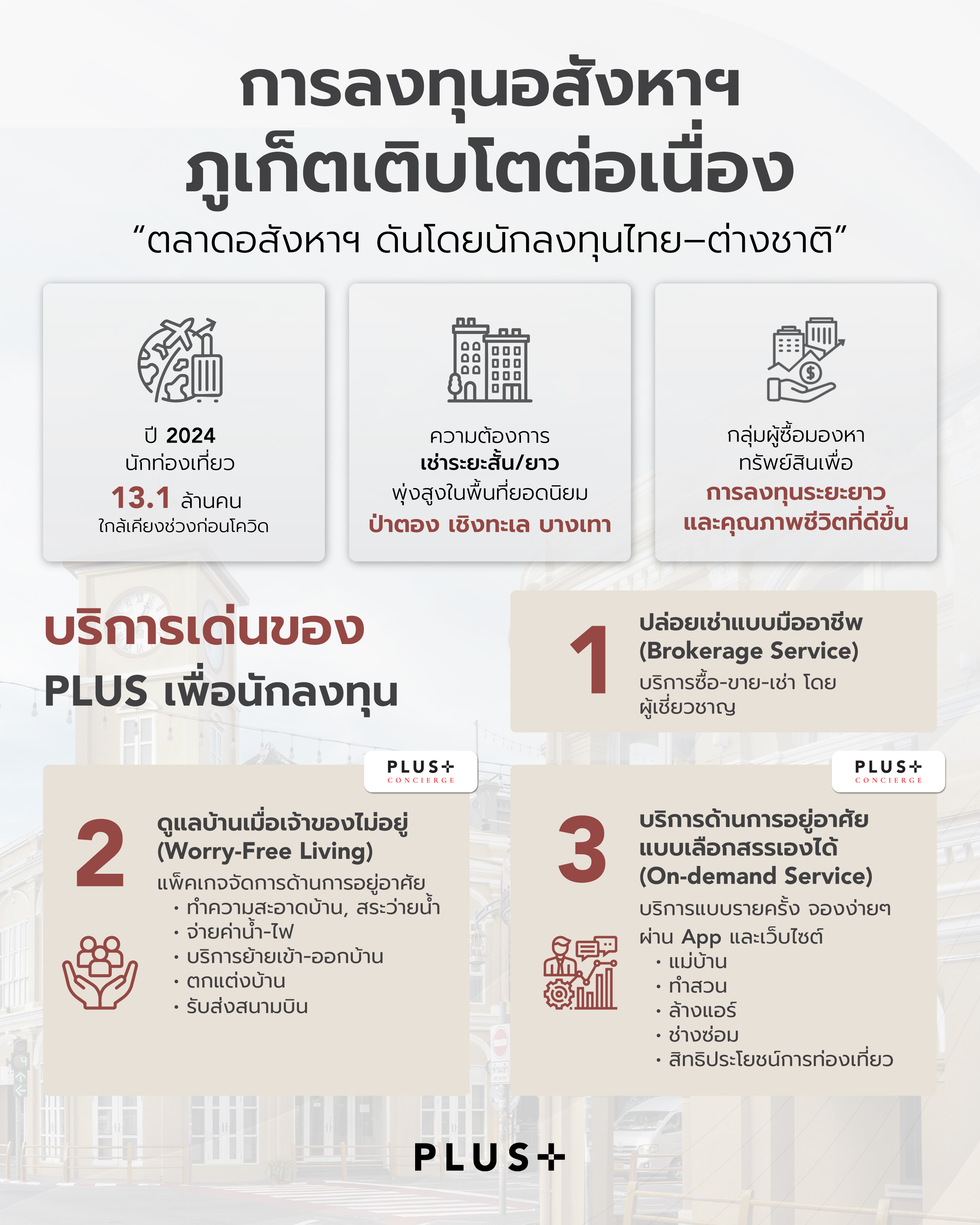 ด้วยประสบการณ์เกือบ 20 ปีในการดูแลอสังหาริมทรัพย์ในภูเก็ต พลัสฯ เข้าใจทั้งบริบทตลาดและความต้องการของลูกค้าอย่างลึกซึ้ง จึงได้ออกแบบบริการแบบครบจบในที่เดียว รองรับทั้งผู้พัฒนาโครงการ นักลงทุน และผู้อยู่อาศัย โดยเฉพาะในช่วงที่ภูเก็ตมีการขยายตัวของกลุ่มผู้ซื้อเพื่อการลงทุนอย่างต่อเนื่อง