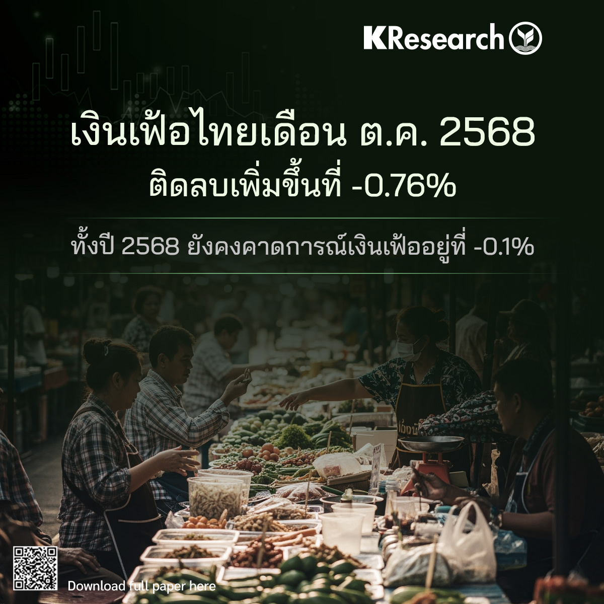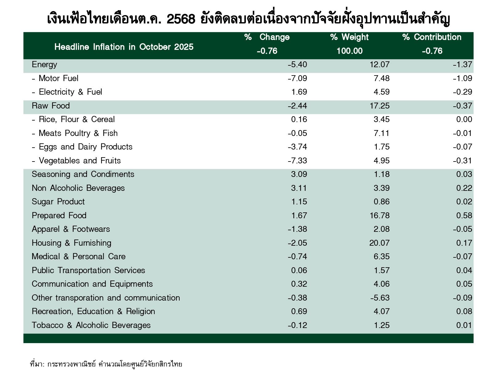 อัตราเงินเฟ้อทั่วไปของไทยเดือน ต.ค. 2568 ยังติดลบเป็นเดือนที่ 7 ต่อเนื่องที่ - 0.76%YoY โดยยังถูกกดดันจากปัจจัยทางฝั่งอุปทานเป็นสำคัญ