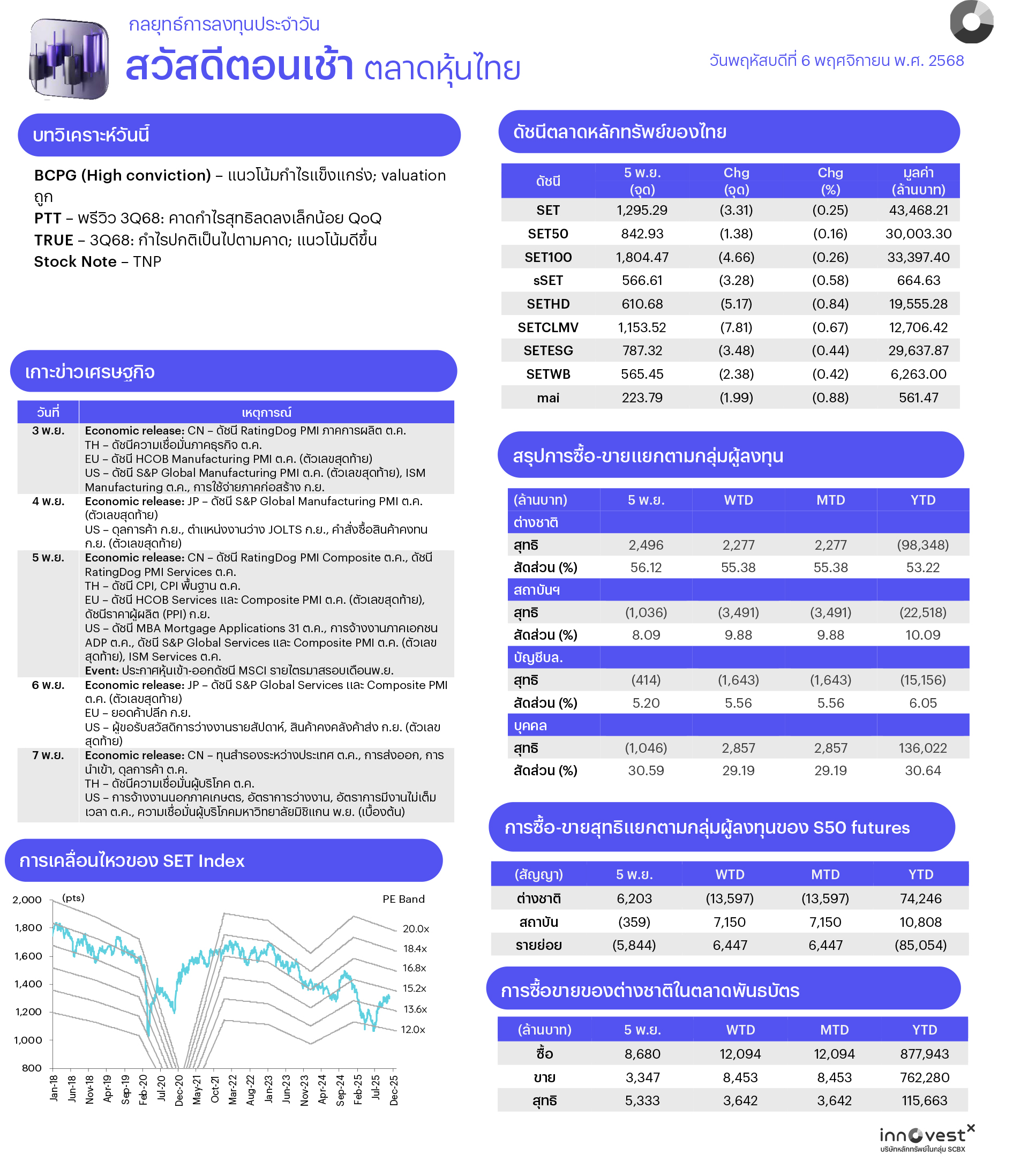 คาดตลาดไซด์เวย์/รีบาวด์ ตลาดยังติดตามผลประกอบการ 3Q68 ในโค้งสุดท้ายหลังกลุ่มธนาคารและสื่อสารออกมาดีกว่าคาดหนุนตลาดไประดับหนึ่งแล้ว ปัจจัยภายนอกตัวเลข ศก.สหรัฐฯ ที่ดีทั้ง ADP Employment และ ISM Services หนุนจิตวิทยาตลาดหุ้นรวม แม้ภาคแรงงานสหรัฐฯ ที่ดีอาจจะทำให้ความจำเป็นในการลดดอกเบี้ยเฟดน้อยลง บวกกับหุ้นเอเชียลดลง เทคนิคตลาดรีบาวด์ที่แนวรับ 1285 ที่ให้ไว้ หากแกว่งขึ้นต่อต้องยืนเหนือ 1300/1305 ส่วนการลงอย่าหลุด 1285 อีก