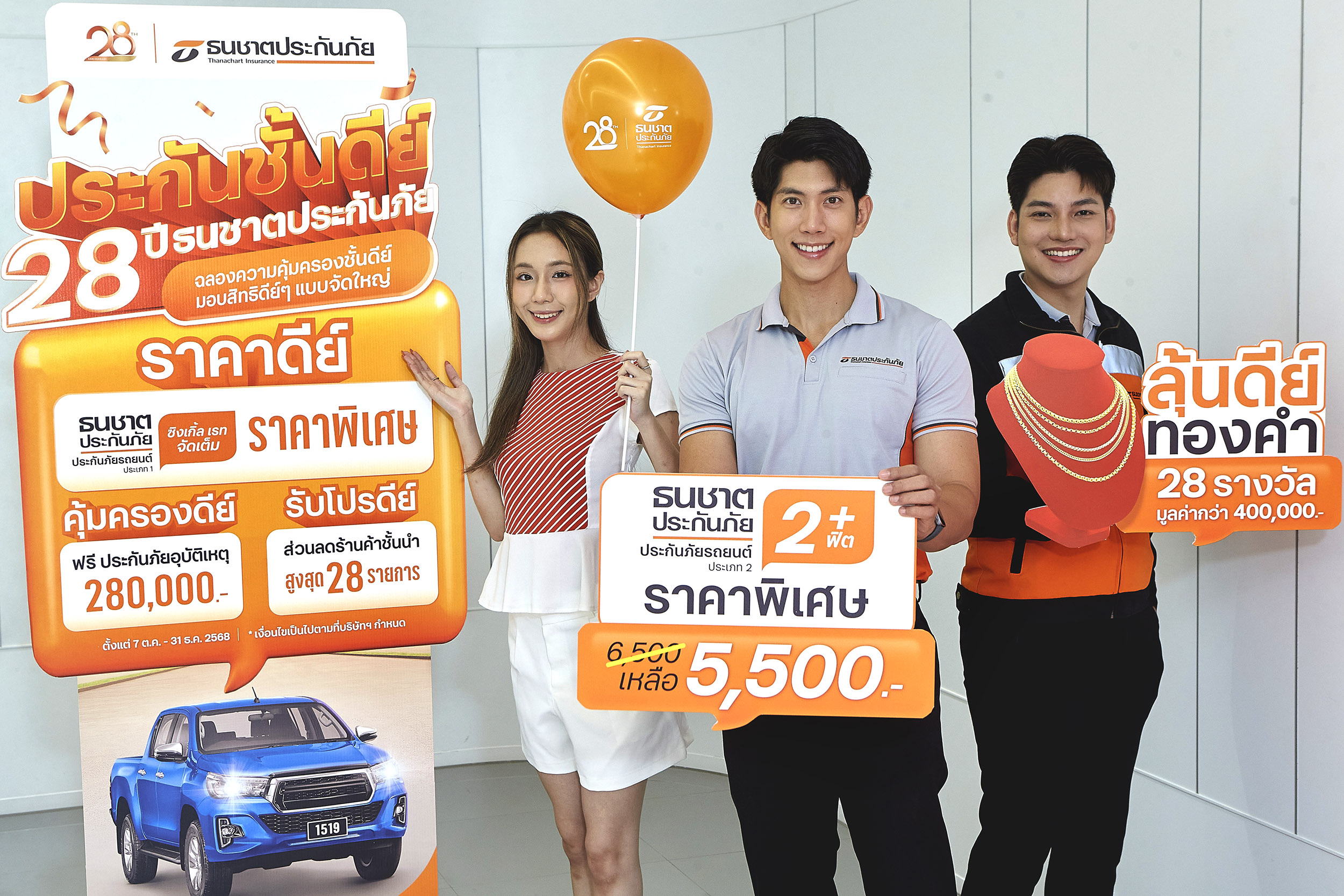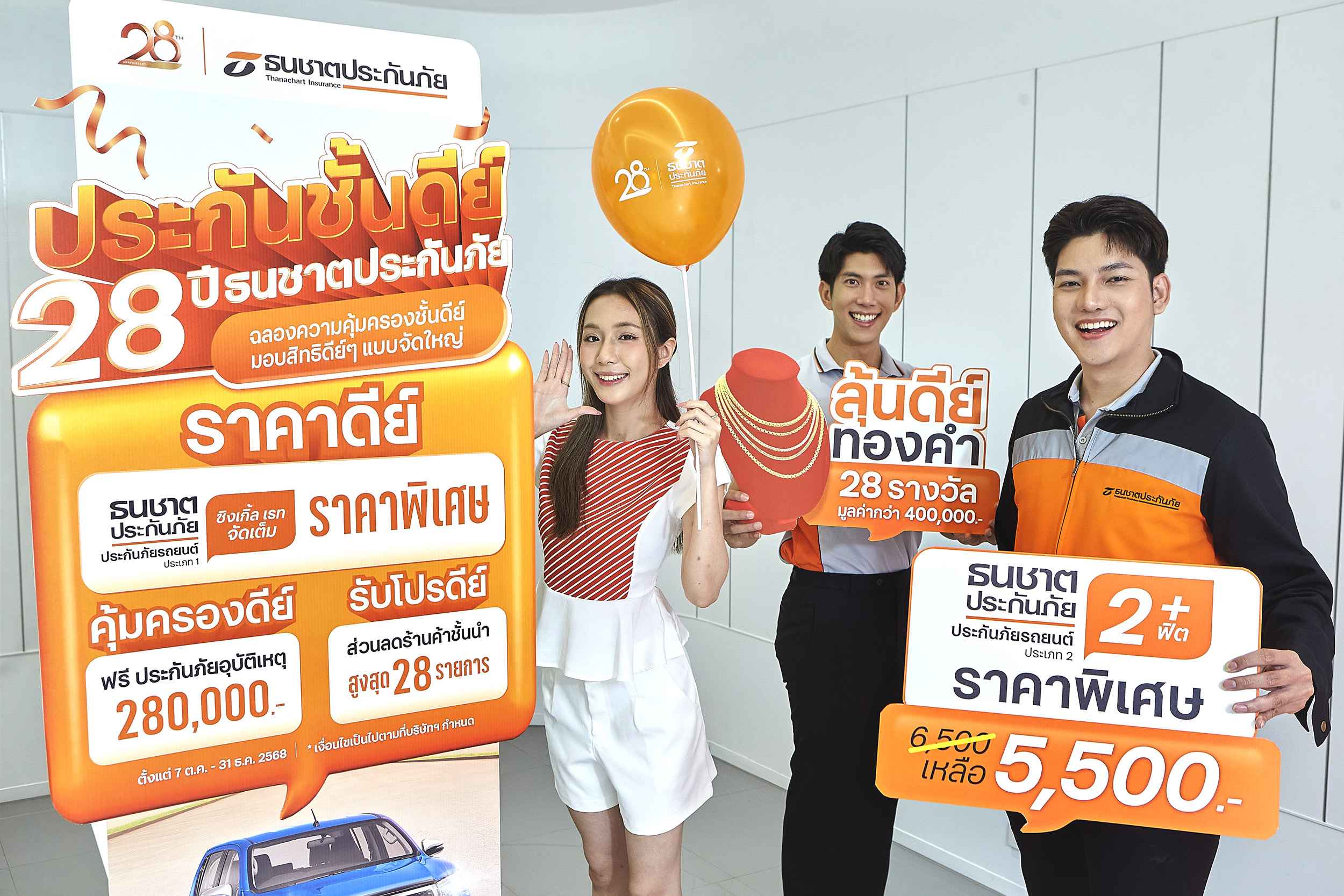ธนชาตประกันภัย ฉลองครบรอบ 28 ปี จัดแคมเปญสุดพิเศษ “ประกันชั้นดีย์” รวมที่สุดของความคุ้มไว้ในหนึ่งเดียว ให้ลูกค้าทั่วไทยได้รับความคุ้มค่าจัดเต็มกว่าที่เคย กับข้อเสนอแรงแห่งปีได้ทั้ง ราคาดีย์! จาก 2 ผลิตภัณฑ์ยอดฮิต “ประกันภัยรถยนต์ ธนชาต ชั้น 1 ซิงเกิลเรท จัดเต็ม” ราคาพิเศษ และ “ประกันภัยรถยนต์ ธนชาต 2+ ฟิต” ราคาเริ่มต้นเพียง 5,500 บาท พร้อม คุ้มครองดีย์! รับฟรี ประกันอุบัติเหตุส่วนบุคคล คุ้มครองสูงสุด 280,000 บาท ต่อด้วย โปรดีย์! สิทธิพิเศษส่วนลดจากร้านค้าชั้นนำทั่วประเทศกว่า 28 รายการ และปิดท้ายด้วย ลุ้นดีย์! ทองคำรวม 28 รางวัล มูลค่ากว่า 400,000 บาท ซึ่งสนับสนุนของรางวัลโดย บริษัท อาร์ที โทเทิล เซอร์วิส จำกัด เพียงซื้อหรือต่ออายุกรมธรรม์ที่ร่วมรายการ มูลค่าเบี้ยตั้งแต่ 3,000 บาทขึ้นไป ร่วมฉลองความคุ้มและอุ่นใจไปกับธนชาตประกันภัยได้ตั้งแต่วันนี้ - 31 ธันวาคม 2568 ผ่านทุกช่องทาง ทั้งเว็บไซต์ www.thanachartinsurance.co.th ติดต่อเจ้าหน้าที่ โทร. 1519 หรือโบรกเกอร์ต่าง ๆ ทั่วประเทศ