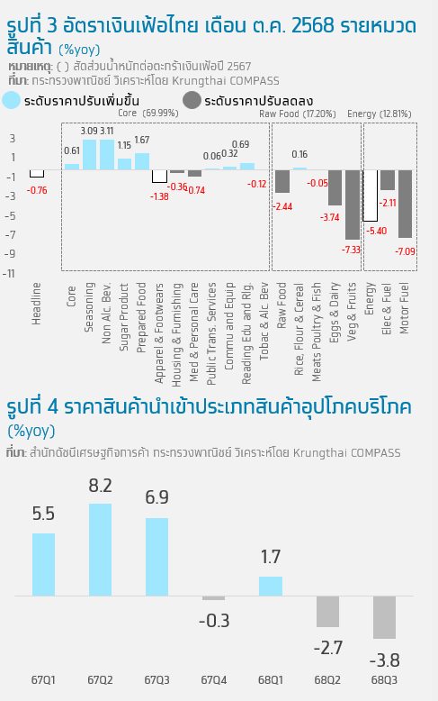 อัตราเงินเฟ้อทั่วไปเดือน ต.ค. 68 อยู่ที่ -0.76% จากระดับราคาพลังงานและสินค้าหมวดอาหารสดที่ปรับตัวลงเป็นสำคัญ