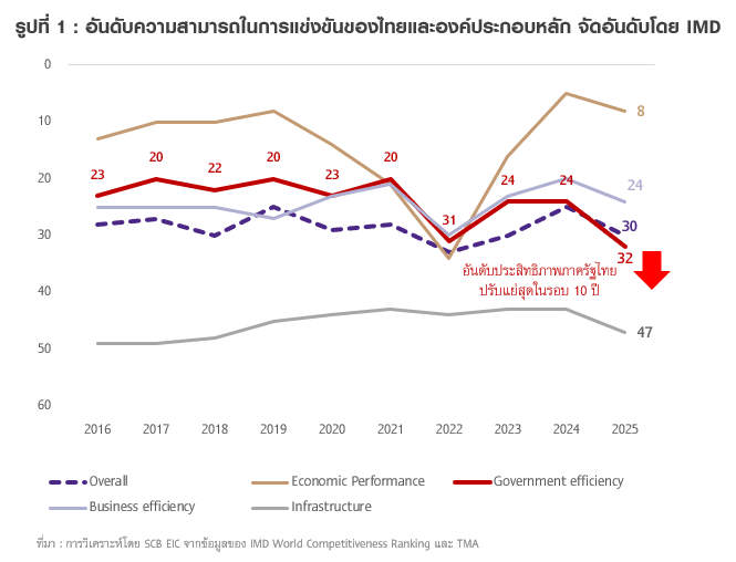 อันดับความสามารถในการแข่งขันของไทย (โดย IMD 2025) ล่าสุดในปี 2025 ร่วงลงมาอยู่ที่อันดับ 30 จาก 69 ประเทศทั่วโลก (จากอันดับ 25 ในปี 2024) โดยเฉพาะด้าน “ประสิทธิภาพภาครัฐ” (Government efficiency) ที่ปรับแย่ลงมากสุดในรอบ 10 ปี ในบางมิติย่อยอันดับแย่ลงมาก เช่น ความโปร่งใส สินบนและคอร์รัปชัน การปรับนโยบายรัฐให้ทันสถานการณ์ และกฎหมายแข่งขันทางการค้า ในขณะที่มาเลเซียแซงไทยไปแล้ว อันดับการแข่งขันปรับดีขึ้นเป็น 23 (ปี 2024 อันดับ 34) มิติ Government efficiency นำไทย อยู่ที่อันดับ 25 (จากอันดับ 33 ปี 2024) สะท้อนชัดว่า กฎเกณฑ์และกลไกของภาครัฐไทยปรับตัวได้ช้า ประสิทธิภาพภาครัฐแข่งขันในโลกแย่ลง กลายเป็นหนึ่งตัวแปรสำคัญฉุดรั้งความสามารถในการแข่งขันของประเทศ