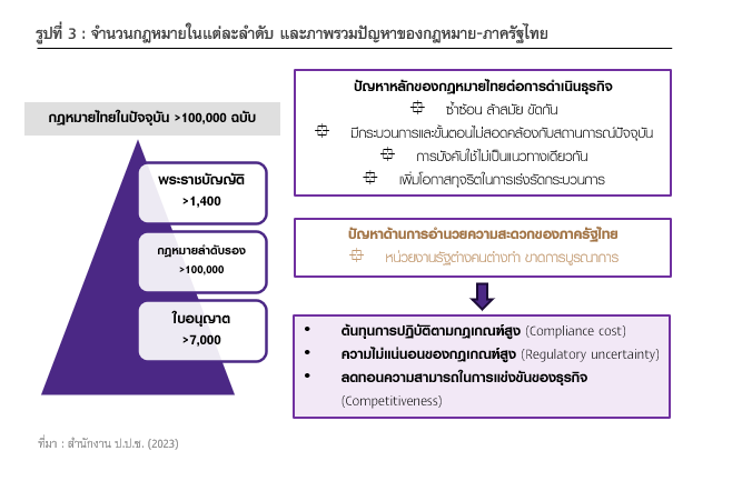 จากข้อมูลของสำนักงาน ป.ป.ช. ระบุว่า ปัจจุบันประเทศไทยมีกฎหมายมากกว่า 100,000 ฉบับซึ่งถือว่ามากเกินไป แบ่งได้เป็นกฎหมายระดับพระราชบัญญัติกว่า 1,400 ฉบับ กฎหมายลำดับรองมากกว่า 100,000 ฉบับ และใบอนุญาตอีกกว่า 7,000 รายการ โดยปัญหาของกฎหมายไทยไม่ได้อยู่ที่จำนวนมากเพียงอย่างเดียว แต่ที่สำคัญคือ กฎหมายจำนวนมากนั้นยังมีความซ้ำซ้อน เข้มงวดล้าสมัย และส่วนใหญ่เป็นกฎหมายที่ออกมาเพื่อแก้ไขปัญหาในอดีต ซึ่งขาดการทบทวนให้เหมาะสมกับบริบทปัจจุบัน อีกทั้ง ยังขาดการเตรียมพร้อมรองรับความท้าทายทางเศรษฐกิจใหม่ ๆ ในอนาคต (รูปที่ 3) ขณะเดียวกัน การบังคับใช้กฎหมายยังเป็นอุปสรรคเพิ่มเติมให้ภาคธุรกิจ เนื่องจากการขาดเอกภาพ หน่วยงานต่าง ๆ ขาดการบูรณาการให้เป็นมาตรฐานเดียวกัน ทำให้เกิดความไม่แน่นอนสูงในการพิจารณากฎหมายต่อภาคธุรกิจและประชาชน
