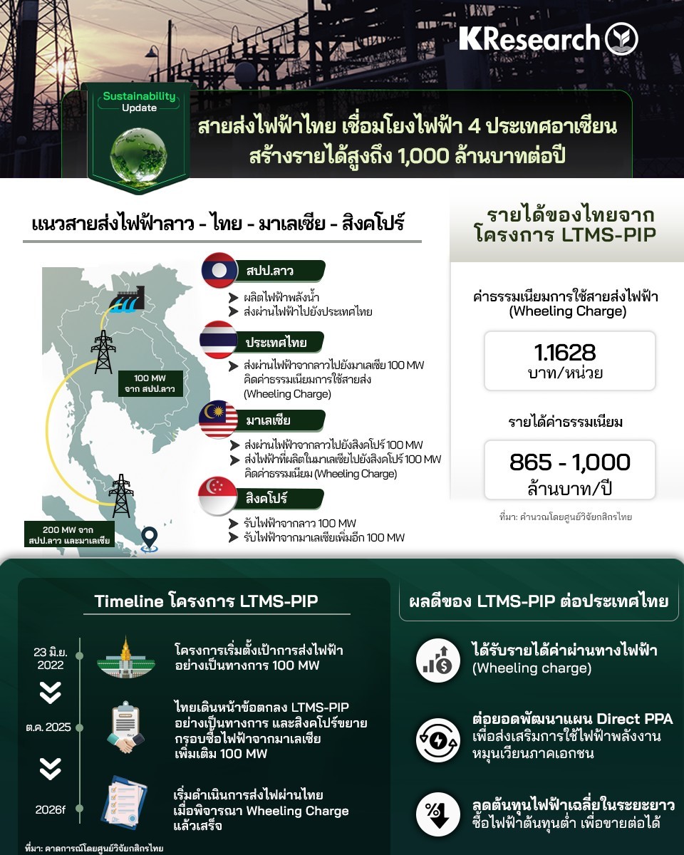 • โครงการส่งไฟฟ้าจากลาวผ่านไทยไปสิงคโปร์ (Lao PDR – Thailand – Malaysia – Singapore Power Integration Project: LTMS-PIP) จะส่งไฟฟ้าพลังน้ำ (hydropower) จากลาวไปยังสิงคโปร์ สูงสุด 100 เมกะวัตต์ (MW) ผ่านโครงข่ายของไทยและมาเลเซีย และจากมาเลเซียไปยังสิงคโปร์อีก 100 MW รวมเป็น 200 MW โดยใช้โครงข่ายสายไฟฟ้าเดิมที่มีอยู่ โดยไม่ต้องลงทุนเพิ่มเติม