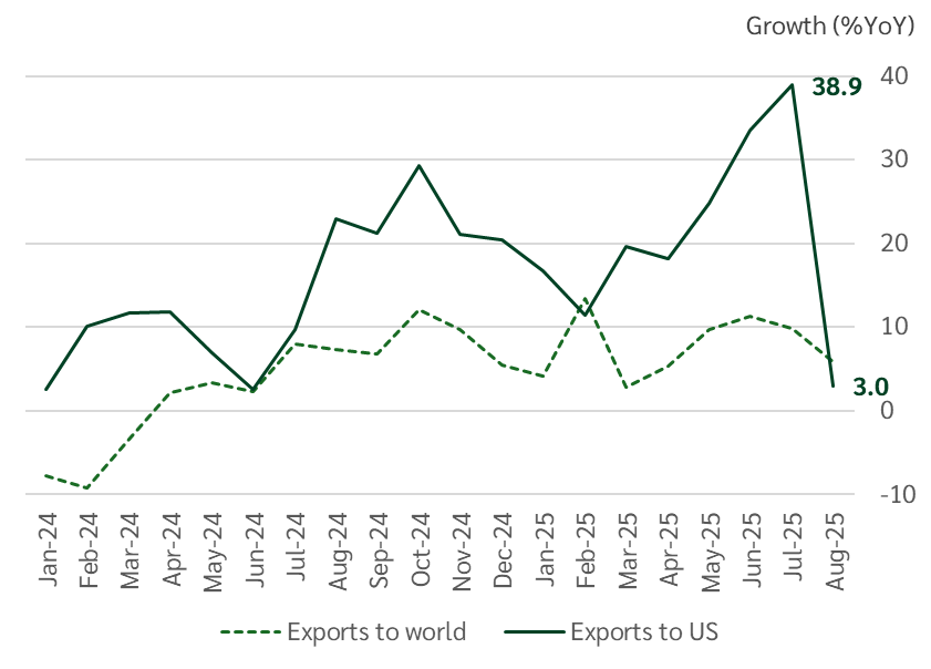 - การส่งออกมีแนวโน้มชะลอตัวในไตรมาสสุดท้ายของปี การส่งออกสินค้าคิดเป็น 23% ของ GDP โดยเฉพาะตลาดสหรัฐฯ ซึ่งมีสัดส่วน 10% ของการส่งออกทั้งหมด เริ่มชะลอตัวชัดเจนในเดือน ส.ค. เหลือเติบโตเพียง 3.0%YoY (จาก 38.8%YoY ในเดือน ก.ค.) (รูปที่ 3) แม้ข้อตกลงทางการค้าจะช่วยลดภาษีนำเข้าสินค้าอินโดนีเซียเหลือ 19% แต่ยังอยู่ในระดับสูง ส่งผลให้สินค้าหลักอย่างปาล์มน้ำมัน รองเท้า เครื่องจักรไฟฟ้า สมาร์ทโฟน ยางล้อ กระเป๋าเดินทาง กุ้งแปรรูป และยางพารา อาจเผชิญแรงกดดันต่อเนื่องจากตลาดสหรัฐฯ ที่ชะลอตัว