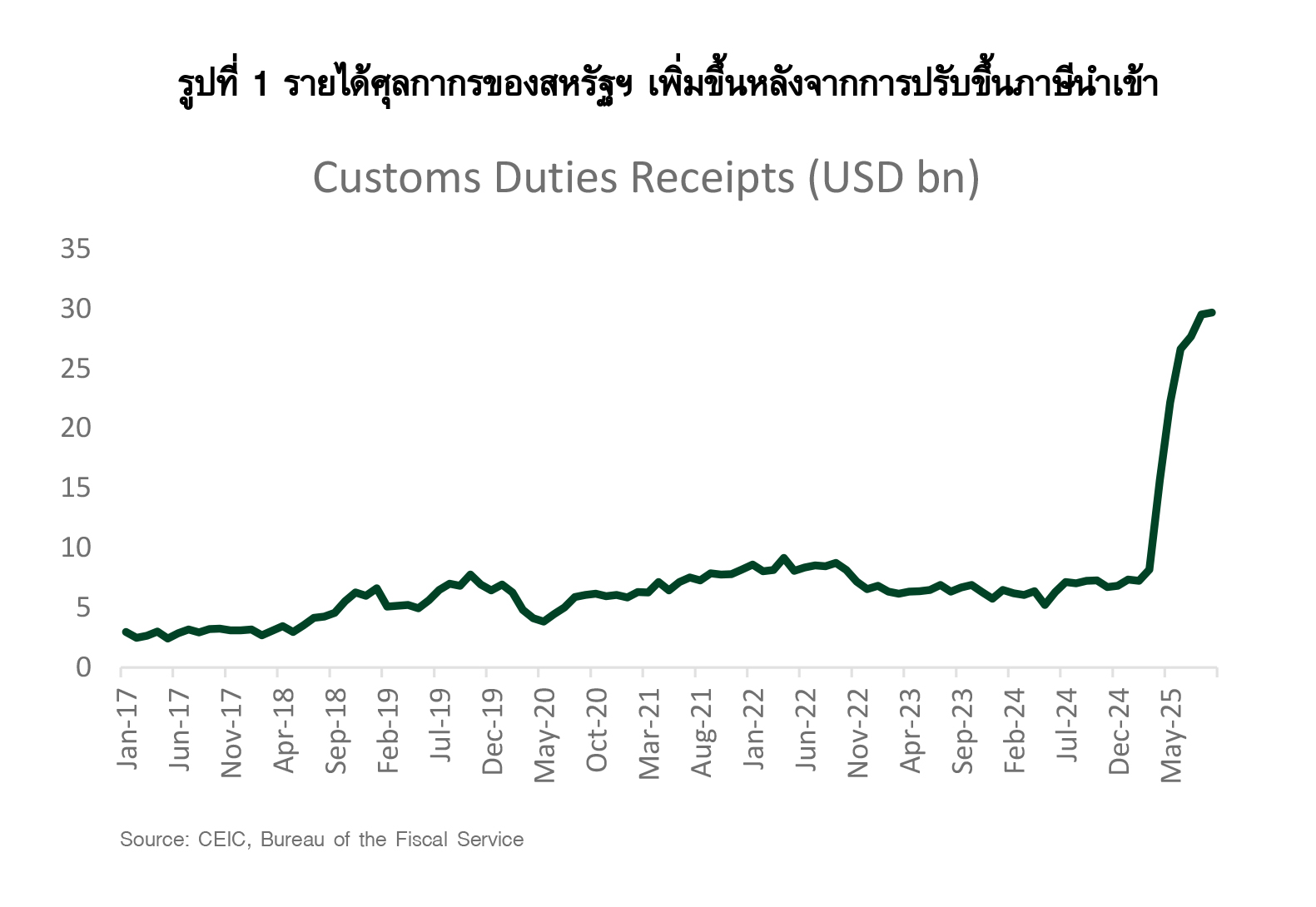 • เปิดทางให้ผู้นำเข้าสหรัฐฯ ยื่นขอคืนภาษีมูลค่าเกือบ 9 หมื่นล้านดอลลาร์ฯ หรือคิดเป็นราว 5% ของการขาดดุลการคลังของสหรัฐฯ ในปีงบประมาณ 2568 (จากข้อมูลของศุลกากรสหรัฐฯ) (รูปที่ 1) ซึ่งหากรัฐบาลสหรัฐต้องคืนภาษีดังกล่าวอาจส่งผลให้การขาดดุลการคลังของสหรัฐฯ เพิ่มสูงขึ้น ภายใต้รายได้ภาครัฐที่มีแนวโน้มลดลงอยู่แล้วจากการปรับลดภาษีตามมาตรการ One Big Beautiful Bill (OBBA)