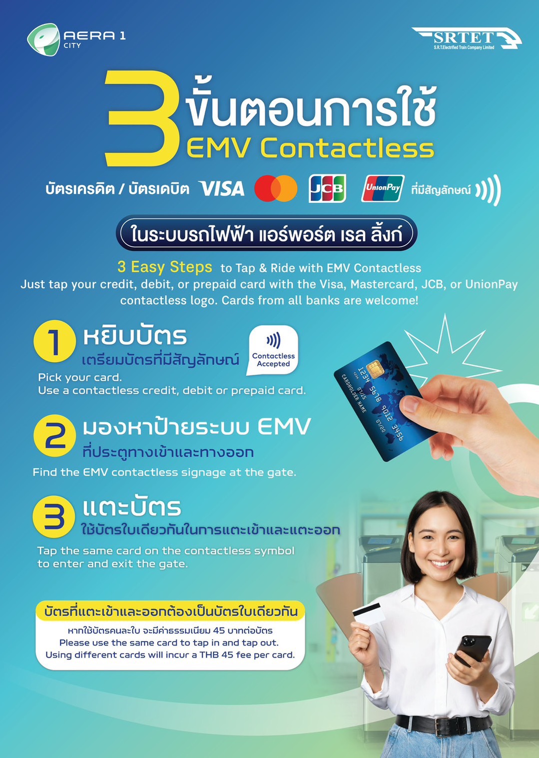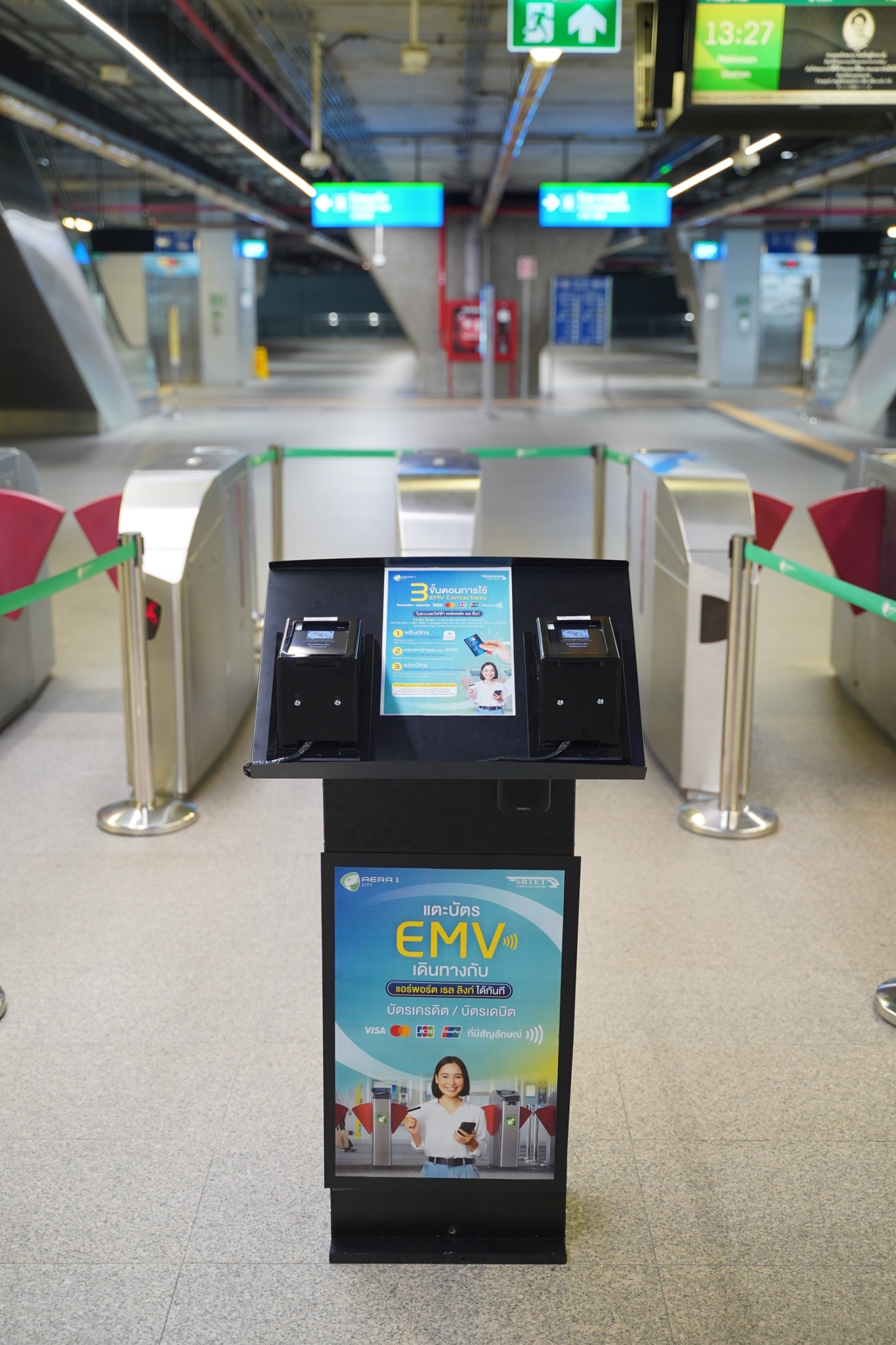 ระบบ EMV Contactless ที่นำมาใช้ จะช่วยอำนวยความสะดวกแก่ผู้โดยสาร เพียงแตะบัตรที่มีสัญลักษณ์ Visa, Mastercard, JCB หรือ UnionPay บนเครื่อง EMV Contactless Counter ซึ่งจะถูกนำมาวางให้บริการบริเวณด้านหน้าประตูทางเข้า และทางออก (Gate) ก็สามารถเข้า–ออกสถานีได้ทันทีโดยไม่จำเป็นต้องซื้อตั๋วหรือเติมเงินล่วงหน้า รองรับบัตรทุกธนาคารที่มีสัญลักษณ์ Contactless Payment เพื่อเพิ่มความคล่องตัวในการเดินทางมากยิ่งขึ้น