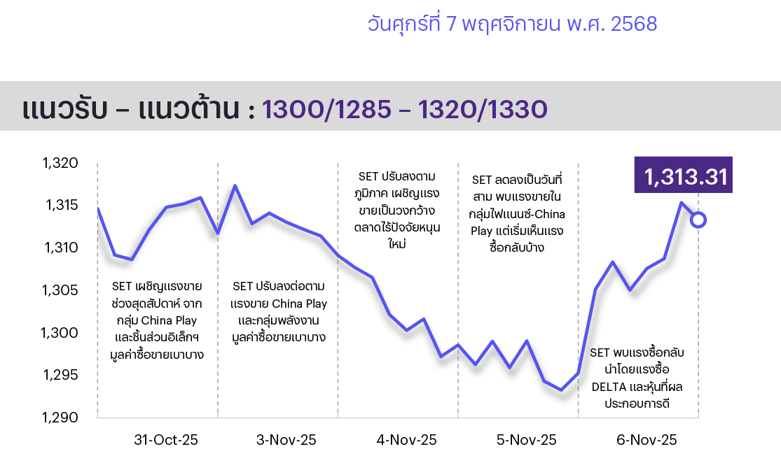 คาดตลาดไซด์เวย์/พักตัว เมื่อวานนี้ DELTA กลับมาหนุนตลาดเป็นหลัก ขณะที่ นลท. ต่างชาติยังขายสุทธิแม้ตลาดปรับตัวขึ้น ติดตามผลประกอบการ 3Q68 โค้งสุดท้ายสัปดาห์หน้า ปัจจัยภายนอกการปิดหน่วยงานราชการสหรัฐฯ ทำสถิติใหม่เป็นวันที่ 38 ส่วนความกังวลเรื่องฟองสบู่หุ้น AI ยังเป็นปัจจัยเฝ้าระวังในระยะกลาง วันนี้ติดตามตัวเลขส่งออกจีนที่อาจมีผลต่อตลาดเอเชีย ทางเทคนิคตลาดยืนเหนือ 1300/1305 ทำให้กลับมาขึ้นแต่การขึ้นคาดยังไม่ผ่าน 1320 การพักอย่าลงหลุด 1300 อีก