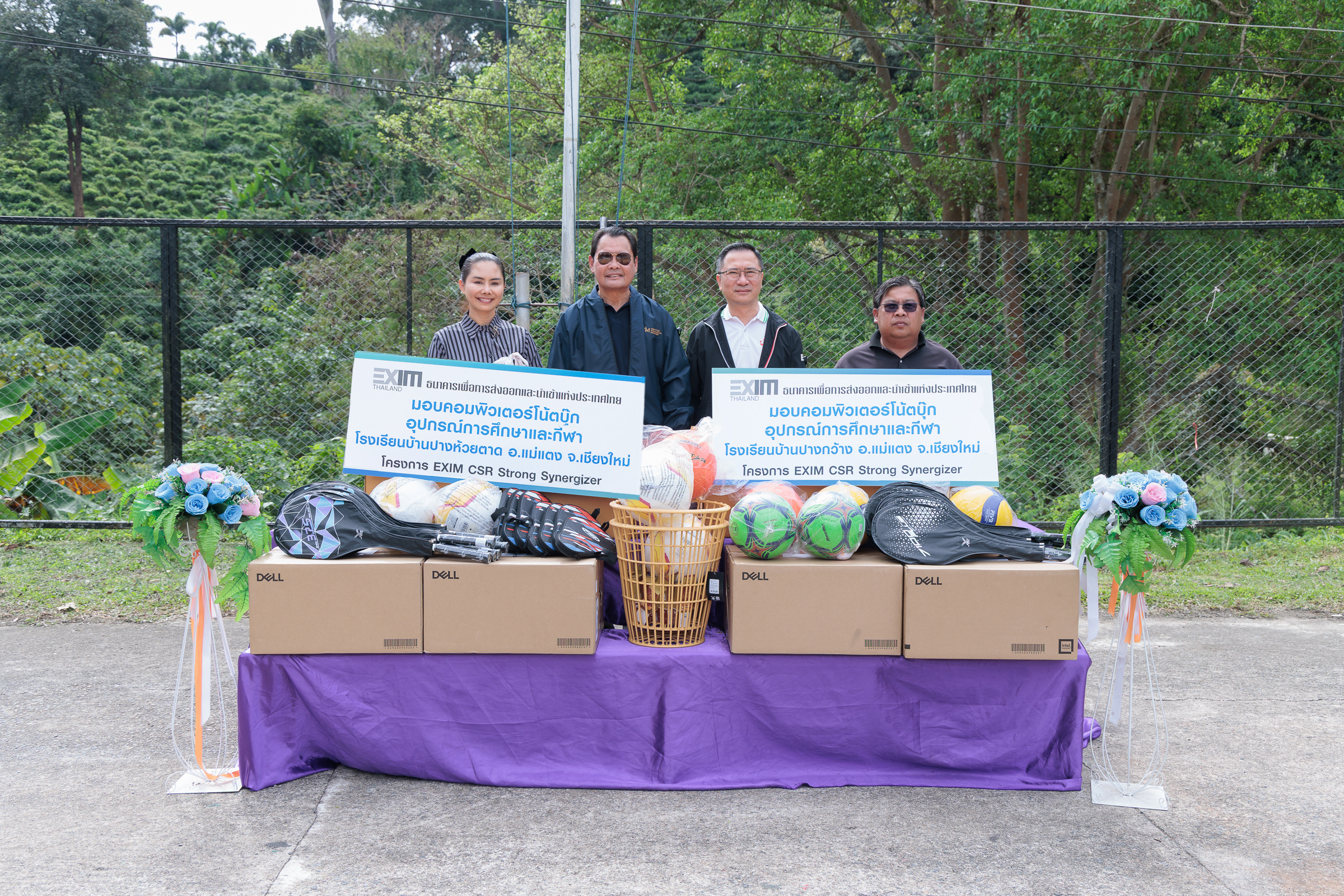 นายชลัช รัตนบุญนิธิ กรรมการผู้จัดการ ธนาคารเพื่อการส่งออกและนำเข้าแห่งประเทศไทย (EXIM BANK) และนายจักริน วังวิวัฒน์ กรรมการผู้จัดการ กลุ่มบริษัท ชาระมิงค์ จำกัด มอบเครื่องคอมพิวเตอร์โน้ตบุ๊ก อุปกรณ์การศึกษา และอุปกรณ์กีฬา ให้กับโรงเรียนบ้านปางห้วยตาด และโรงเรียนบ้านปางกว้าง อำเภอแม่แตง จังหวัดเชียงใหม่ ภายใต้โครงการ “EXIM CSR Strong Synergizer” เพื่อสนับสนุนการศึกษาและการพัฒนาคุณภาพชีวิตของเด็กและเยาวชนในพื้นที่ห่างไกล เพื่อส่งเสริมให้เด็กได้เรียนรู้อย่างเต็มศักยภาพ ควบคู่ไปกับการเล่นกีฬาและใช้เวลาว่างให้เกิดประโยชน์ โดยมีนางสาวอลินดา ศิริธีรธาดา ผู้อำนวยการโรงเรียนบ้านปางห้วยตาด และนายวิธาน บุญญา ผู้อำนวยการโรงเรียนบ้านปางกว้าง เป็นผู้รับมอบ ณ โรงเรียนบ้านปางห้วยตาด อำเภอแม่แตง จังหวัดเชียงใหม่ เมื่อวันที่ 8 พฤศจิกายน 2568