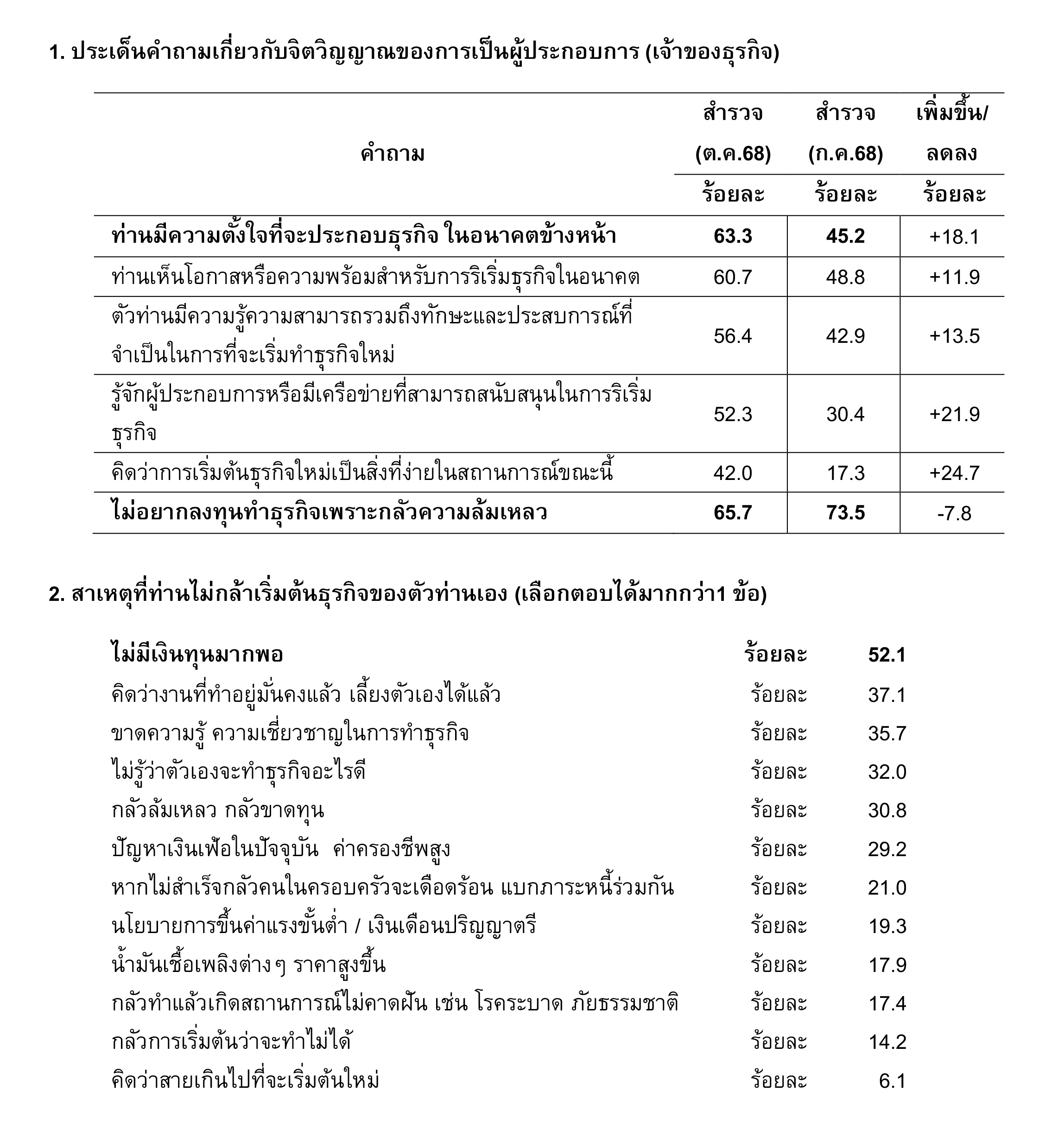 การสำรวจความเห็นเกี่ยวกับจิตวิญญาณของการเป็นผู้ประกอบการ (เจ้าของธุรกิจ) ประจำไตรมาส 3 ของปี 2568 โดยได้ทำการเปรียบเทียบกับการสำรวจครั้งที่ผ่านมา (ช่วงเดือน ก.ค. 2568) ในประเด็นต่างๆ พบว่า มีความตั้งใจที่จะประกอบธุรกิจ ในอนาคตข้างหน้ามากที่สุด คิดเป็นร้อยละ 63.3 (โดยเพิ่มขึ้น ร้อยละ 18.1) รองลงมาคือ เห็นโอกาสหรือความพร้อมสำหรับการริเริ่มธุรกิจในอนาคต คิดเป็นร้อยละ 60.7 (เพิ่มขึ้นร้อยละ 11.9) และมีความรู้ความสามารถรวมถึงทักษะและประสบการณ์ที่จำเป็นในการที่จะเริ่มทำธุรกิจใหม่ คิดเป็นร้อยละ 56.4 (เพิ่มขึ้นร้อยละ 13.5) ขณะที่เห็นว่าไม่อยากลงทุนทำธุรกิจเพราะกลัวความล้มเหลว คิดเป็นร้อยละ 65.7 (ลดลงร้อยละ 7.8)