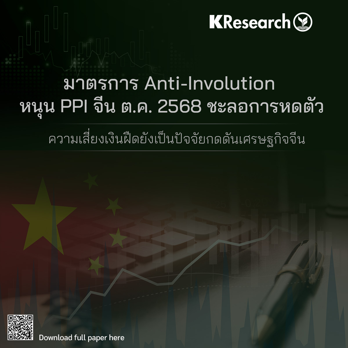 ศูนย์วิจัยกสิกรไทยมองว่าความเสี่ยงด้านเงินฝืดจะยังเป็นปัจจัยกดดันเศรษฐกิจจีนในช่วงที่เหลือของปี 2568 จนถึงปีหน้า การบริโภคในประเทศยังมีทิศทางอ่อนแอ ขณะที่โครงการของเก่าแลกของเก่าเริ่มส่งผลบวกต่อการใช้จ่ายในประเทศลดลง มาตรการหนุนการใช้จ่ายในประเทศเพิ่มเติมยังมีความจำเป็น